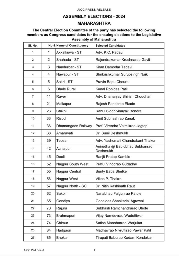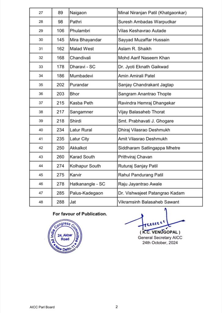 इसके अलावे लिस्ट में नागपुर नॉर्थ से नितिन राउत, लातूर सिटी से अमित देशमुख, लातूर रूरल से धीरज देशमुख, संगमनेर से बालासाहब थोराट, मलाड वेस्ट से असलम शेख़, चांदीवली से आरिफ़ नसीम ख़ान, धारावी से ज्योति गायकवाड़, नागपुर सेंट्रल से बंटी शेलके और नागपुर वेस्ट से विकास ठाकरे जैसे बड़े नेताओं के नाम शामिल हैं।