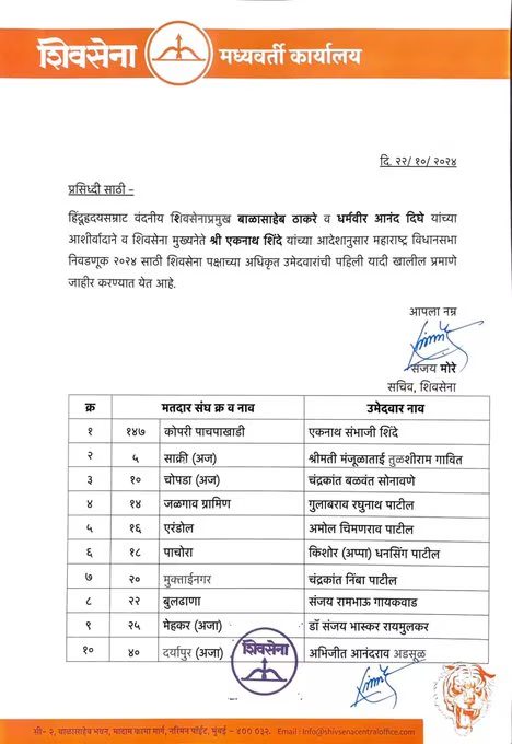 लिस्ट में परिवार की झलक भी देखने को मिली है। साथ ही कई निर्दलीय उम्मीदवारों को भी टिकट दिया गया है। इनमें रामटेक सीट से आशीष जयसवाल, भंडारा से नरेंद्र भोंडेकर, वैजापुर से रमेश बोरनारे और उमरगा से ज्ञानराज चौगुले को टिकट दिया गया है।