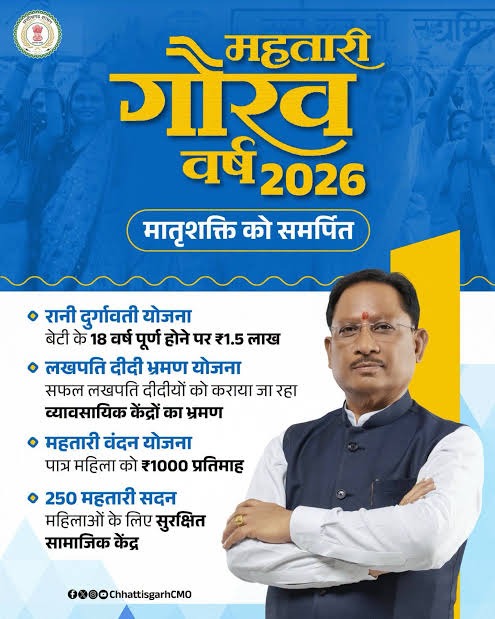 छत्तीसगढ़ के इतिहास में एक मील का पत्थर साबित हो रहा है “महतारी गौरव वर्ष 2026”। नारी सम्मान, आत्मनिर्भरता और सामाजिक समानता की दिशा में एक क्रांतिकारी कदम इस पहल से राज्य सरकार ने यह सिद्ध कर दिया है कि जब शासन की नीतियों में संवेदनशीलता और दूरदर्शिता होती है तो समाज के हर वर्ग तक विकास की रोशनी पहुंचती है।