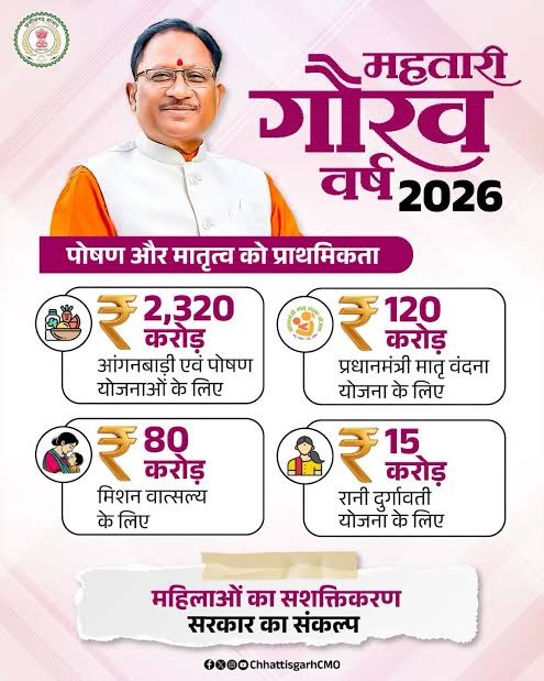 वर्ष 2026-27 का बजट “महतारी गौरव वर्ष” के संकल्पों को साकार करने वाला है क्योंक इस बजट में महिला एवं बाल विकास के लिए 8,245 करोड़ रुपए का प्रावधान रखा गया है। इस बजट से आंगनबाड़ी, पोषण और सामाजिक सुरक्षा योजनाओं को सुदृढ़ करने पर विशेष ध्यान दिए जाएँगे, बुनियादी ढांचे के विकास के लिए महतारी सदनों और नए आंगनबाड़ी केंद्रों का निर्माण किया जाएगा। संक्षेप में कहें तो यह बजट महिलाओं के आत्मविश्वास और स्वाभिमान को सशक्त करने का रोडमैप है।