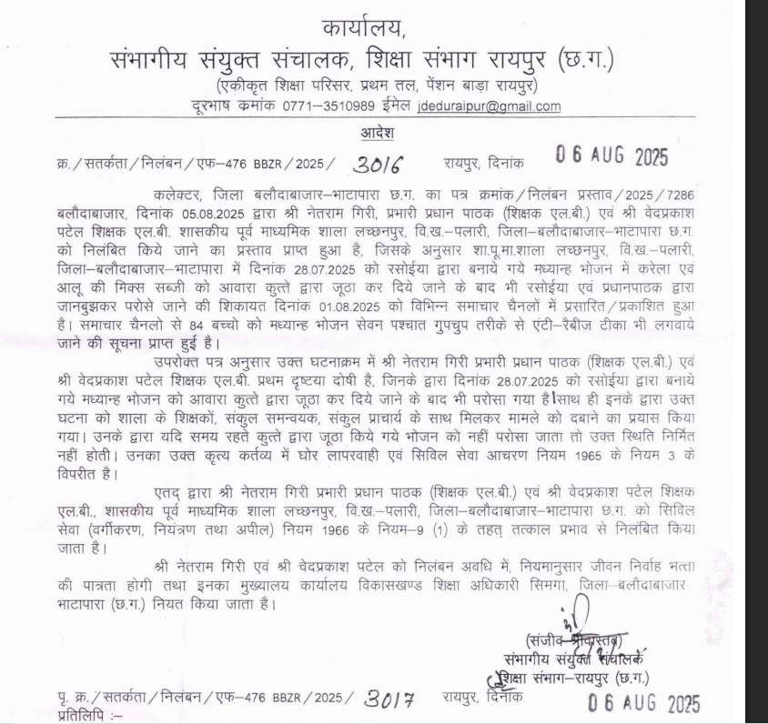 कर्तव्य में घोर लापरवाही एवं सिविल सेवा आचरण नियम 1965 के नियम 3 (1),(2),(3) एवं 3 (2) के उल्लंघन पर संचालक लोक शिक्षण छत्तीसगढ़ ने प्रभारी प्रधानपाठक नेतराम गिरि एवं शिक्षक एलबी वेदप्रकाश पटेल को तत्काल प्रभाव से निलंबित कर दिया। निलंबन अवधि में प्रधानपाठक नेतराम गिरि व शिक्षक वेदप्रकाश पटेल का मुख्यालय विकासखण्ड शिक्षा अधिकारी कार्यालय सिमगा नियत किया गया है। निलंबन अवधि में नियमानुसार जीवन निर्वाह भत्ता भत्ते की पात्रता होगी।