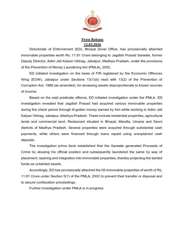 कुमार इंदर, जबलपुर। मध्यप्रदेश के भोपाल जोनल ऑफिस ने आय से अधिक संपत्ति मामले में बड़ी कार्रवाई की है। इसी कड़ी में आय से अधिक संपत्ति मामले में 11.81 करोड़ की संपत्ति अटैच की गई है। यह कार्रवाई PMLA, 2002 के तहत की गई है।