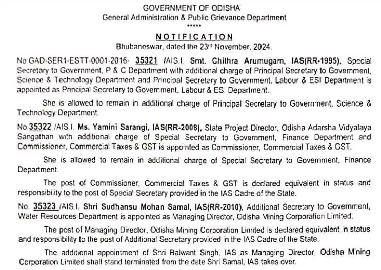 जारी आदेश के अनुसार, आईएएस चित्रा अरुमुगम को श्रम एवं ईएसआई प्रौद्योगिकी विभाग के प्रधान सचिव पद पर नियुक्त किया गया है. वहीं आईएएस यामिनी सारंगी वाणिज्यिक कर एवं जीएसटी आयुक्त के पद पर नियुक्त किया गया है. इसके अलावा वित्त विभाग के विशेष सचिव पद का अतिरिक्त प्रभार भी सौंपा गया है.