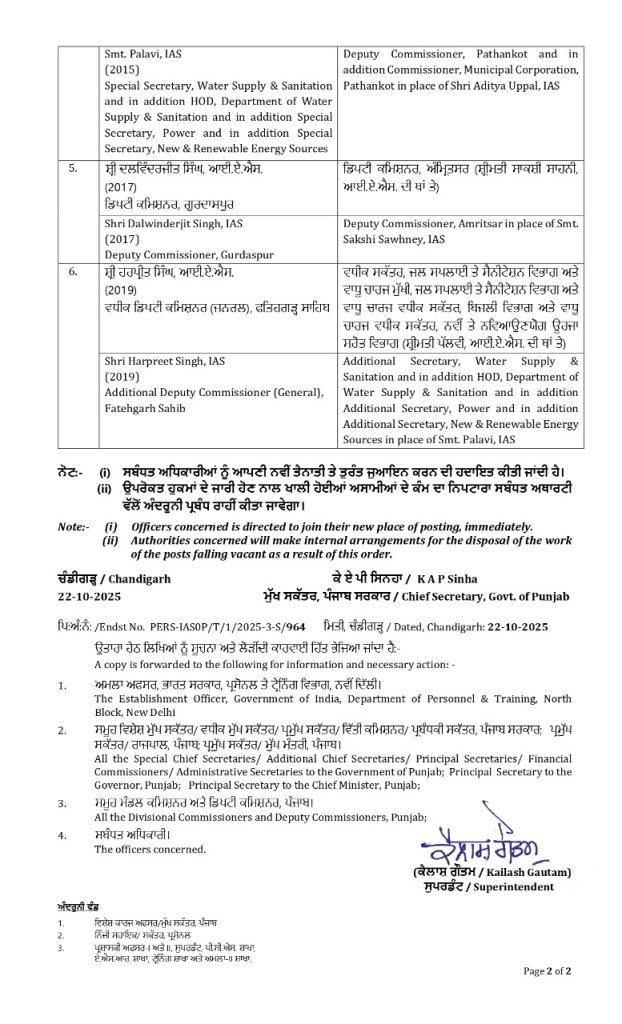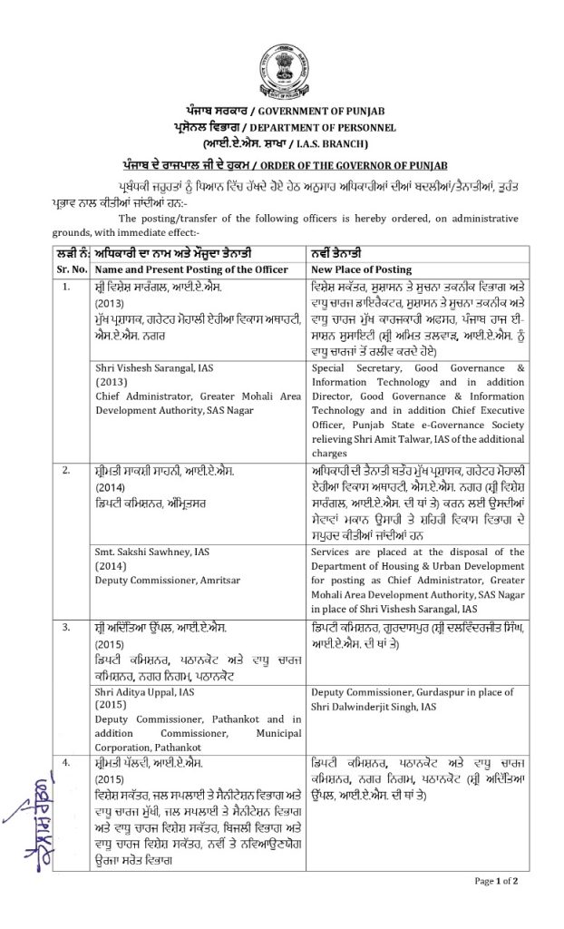 विशेष सरंगल, आईएएस (2013 बैच) अब उन्हें स्पेशल सेक्रेटरी, गुड गवर्नेंस एंड इन्फॉर्मेशन टेक्नोलॉजी के रूप में नियुक्त किया गया है। इसके साथ ही वे डायरेक्टर, गुड गवर्नेंस एंड इन्फॉर्मेशन टेक्नोलॉजी और सीईओ, पंजाब स्टेट ई-गवर्नेंस सोसाइटी का अतिरिक्त कार्यभार संभालेंगे। साक्षी साहनी, आईएएस (2014 बैच) वर्तमान में डिप्टी कमिश्नर अमृतसर रहीं साक्षी साहनी को चीफ एडमिनिस्ट्रेटर, ग्रेटर मोहाली एरिया डेवलपमेंट अथॉरिटी (GMADA) बनाया गया है।