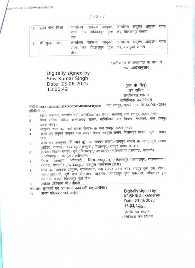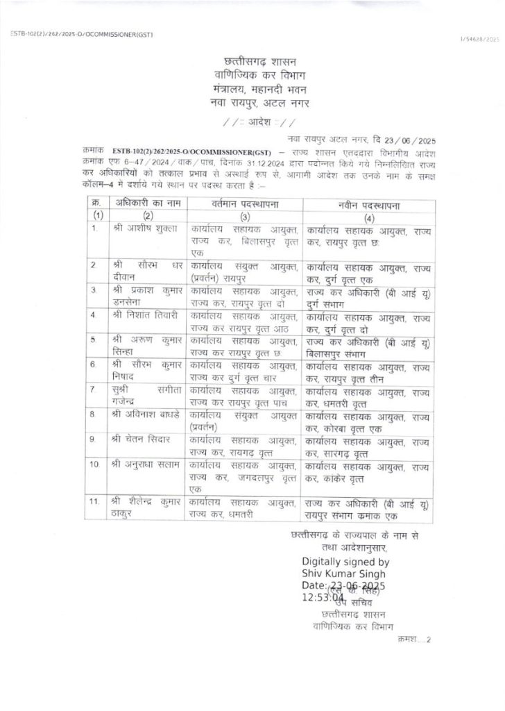 जारी आदेश के तहत सहायक आयुक्त और संयुक्त आयुक्त स्तर के कुल 28 अधिकारियों को इधर-उधर किया गया है। इनमें से कुछ अधिकारियों को संयुक्त आयुक्त (राज्य कर) के रूप में पदस्थ किया गया है, जबकि कुछ को राज्य कर अधिकारी (BIU) और ऑडिट शाखा की जिम्मेदारी सौंपी गई है।
