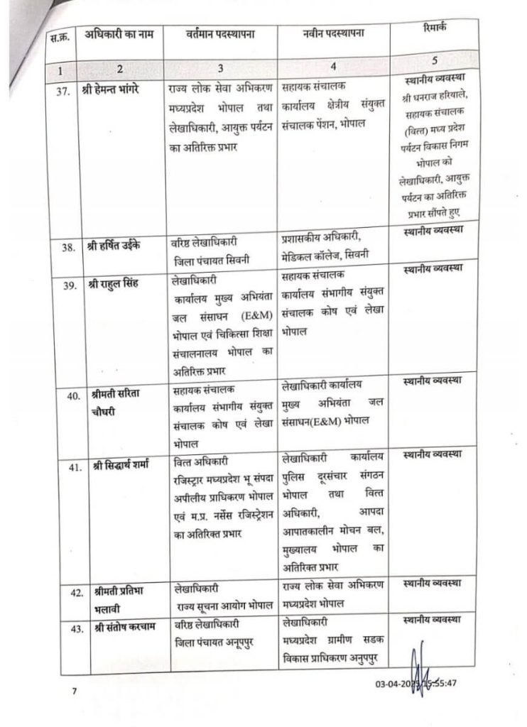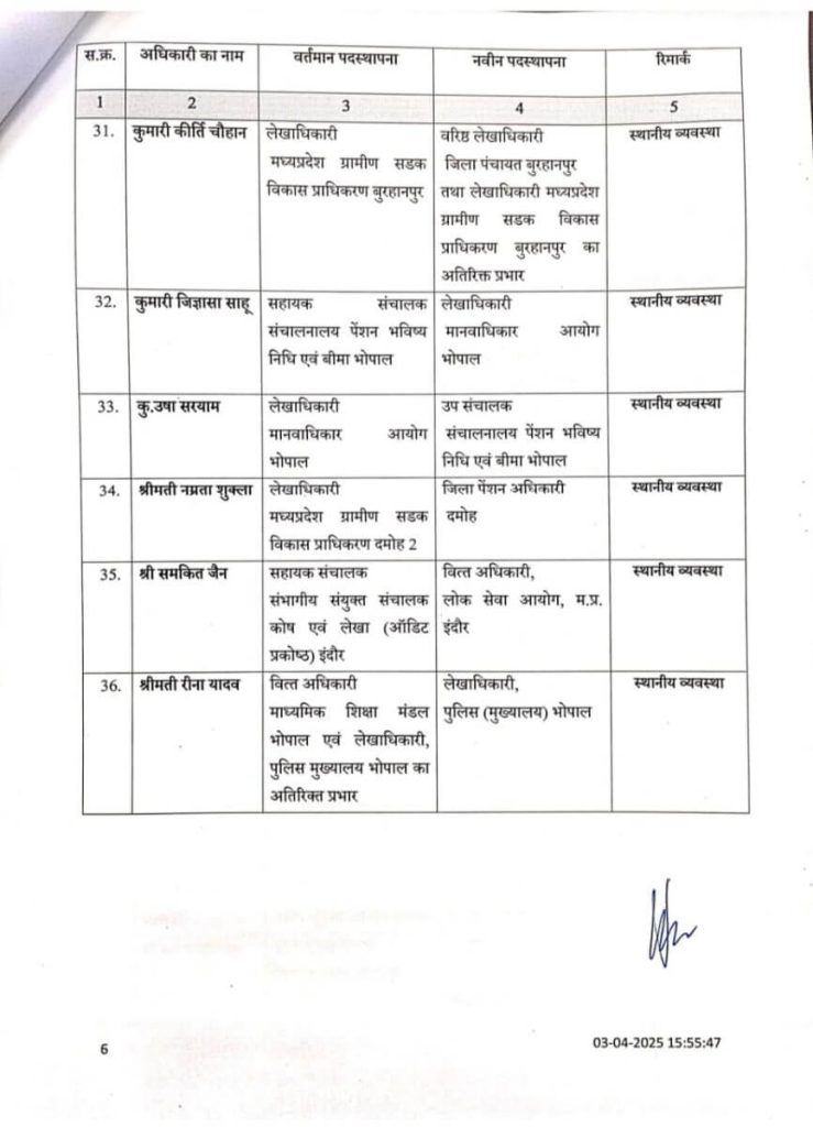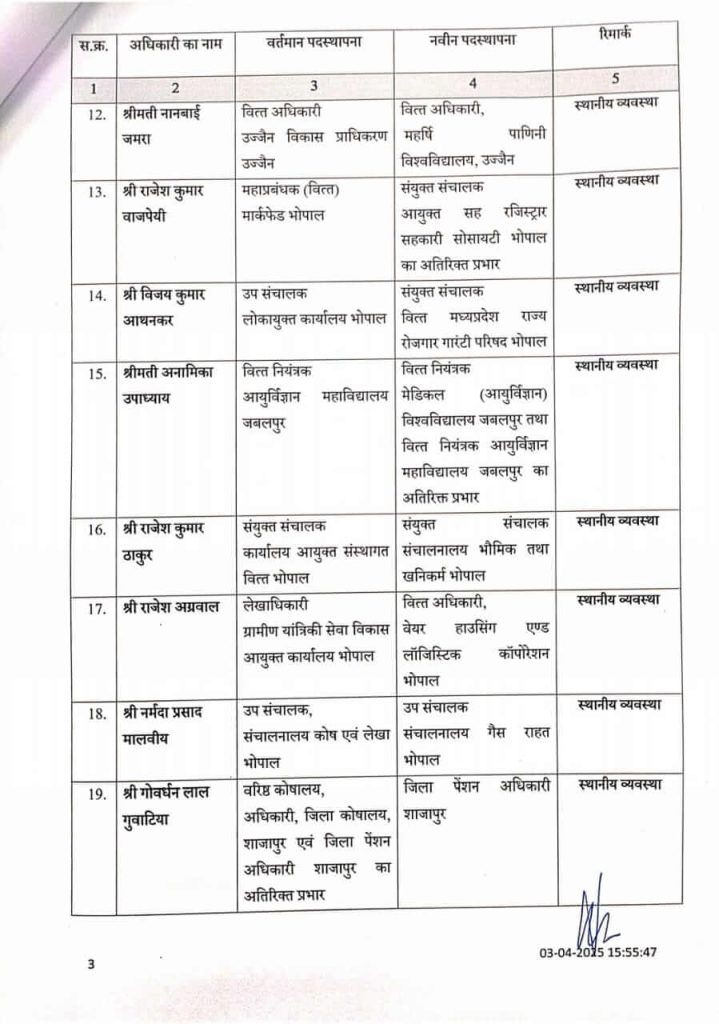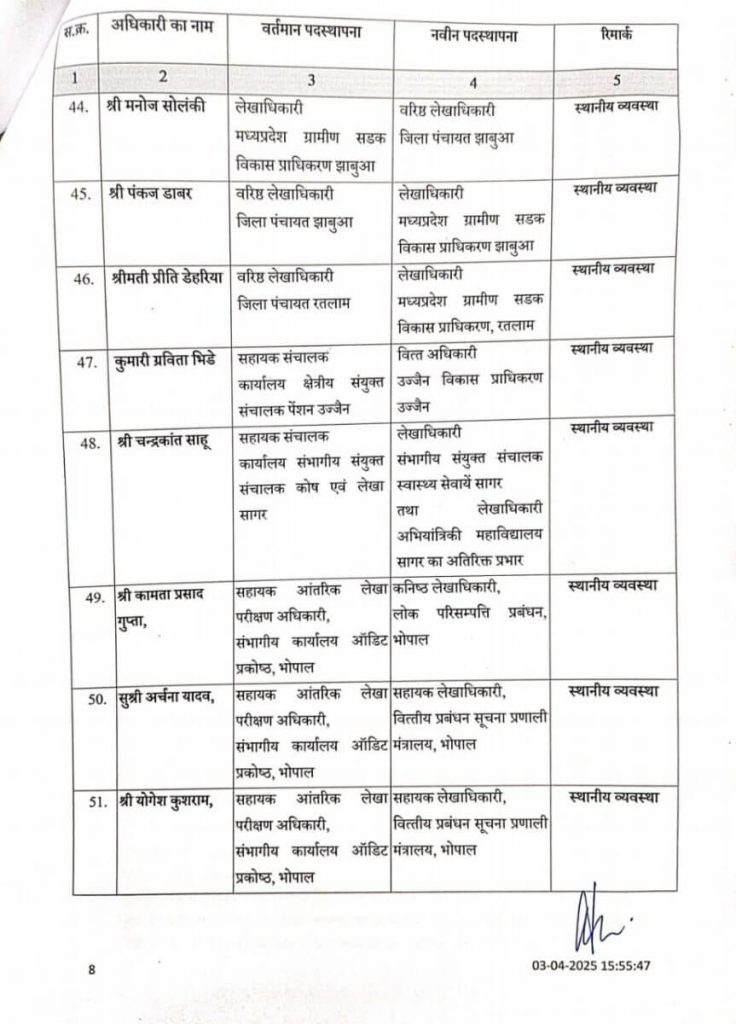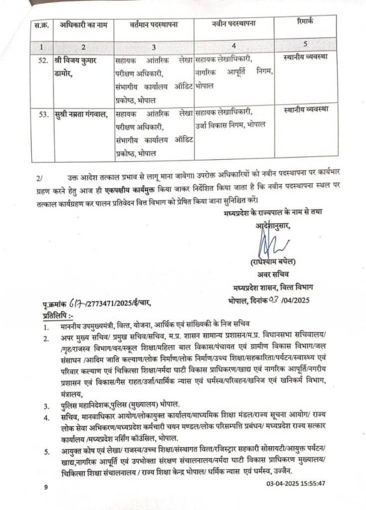 राकेश चतुर्वेदी, भोपाल। राज्य शासन ने मध्य प्रदेश वित्त सेवा अधिकारियों के बड़े पैमाने पर तबादला आदेश जारी किये हैं, वित्त विभाग से जारी आदेश में 53 अधिकारियों के नाम है जिन्हें एक जगह से दूसरी जगह पदस्थ किया गया है। आदेश में कहा गया है कि ट्रांसफर किये गए सभी अधिकारियों को एकपक्षीय कार्यमुक्त किया जाता है ये आदेश तत्काल प्रभाव से लागू होगा इसलिए नई पदस्थापना वाली जगह कार्यभार ग्रहण कर वित्त विभाग को सूचित किया जाए।