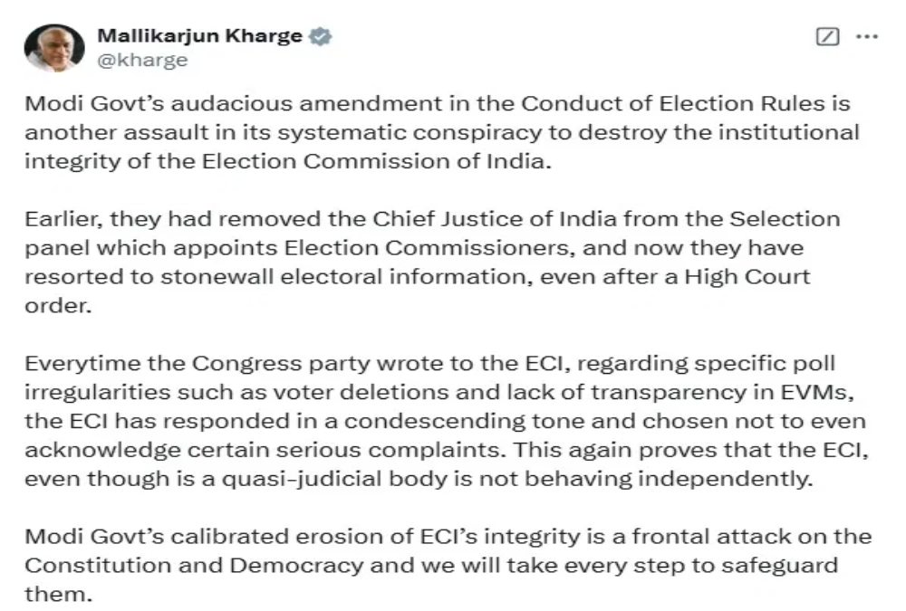 कांग्रेस अध्यक्ष मल्लिकार्जुन खरगे ने कहा कि चुनाव संचालन नियमों में किया गया ये दुस्साहस सरकार की सुनियोजित साजिश का हिस्सा है. खरगे ने कहा कि चुनाव आयोग की अखंडता को जानबूझकर नुकसान पहुंचाना संविधान और लोकतंत्र पर सीधा हमला है और हम उनकी रक्षा के लिए हर कदम उठाएंगे. खरगे ने इस कदम की तुलना चुनाव आयोग की नियुक्ति करने वाले चयन पैनल से भारत के मुख्य न्यायाधीश को हटाने से की और कहा, “सरकार द्वारा भारत के चुनाव आयोग की अखंडता को नष्ट करना संविधान और लोकतंत्र पर सीधा हमला है और हम उसकी रक्षा के लिए हर कदम उठाएंगे.”