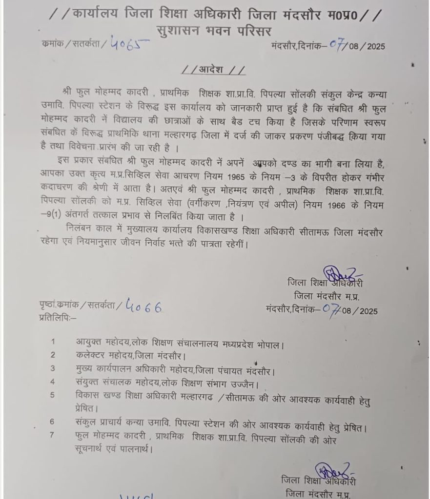 प्रीत शर्मा, मंदसौर। मध्य प्रदेश के मंदसौर जिले में प्राइमरी स्कूल के शिक्षक ने नाबालिग छात्राओं के साथ गंदी हरकत की। हिंदू संगठनों ने टीचर को पकड़कर पुलिस के हवाले किया। पुलिस ने मामला दर्ज कर जेल भेज दिया है। वहीं जिला शिक्षा अधिकारी ने शिक्षक को निलंबित कर दिया है। यह मामला जिले के मल्हारगढ़ थाना क्षेत्र का है।