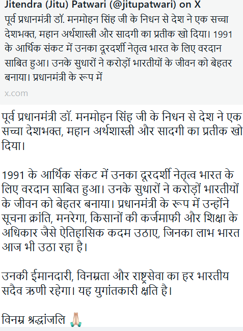 सिंघार ने X पर लिखा-भारतीय राजनीति के अद्भुत नेता और महान अर्थशास्त्री मनमोहन सिंह जी को श्रद्धांजलि !!! देश ने आज एक महान व्यक्ति, दुनिया के सर्वाधिक योग्य अर्थशास्त्री डॉ_मनमोहन_सिंह जी को खो दिया! अपने प्रधानमंत्रित्व कार्यकाल में उन्होंने देश की अर्थव्यवस्था को नया आधार दिया था। वित्त मंत्री (1991-1996): उदारीकरण, वैश्वीकरण और निजीकरण (LPG) की नीति लागू की। विश्व बैंक और IMF के साथ अनुभव: उन्होंने वैश्विक आर्थिक मंचों पर भारत का प्रतिनिधित्व किया। पारदर्शी और दीर्घकालिक आर्थिक नीतियाँ दी। विदेश नीति, भविष्य की योजनाओं और दीर्धकालिक सामाजिक नीतियों के अलावा उन्होंने अमेरिका से असैनिक परमाणु समझौता करवाया था। वित्तमंत्री के रूप में भी उनकी उपलब्धियां आज भी याद की जाती है। ऐसी महान विभूति और कांग्रेस के सम्मानित नेता को श्रद्धांजलि!