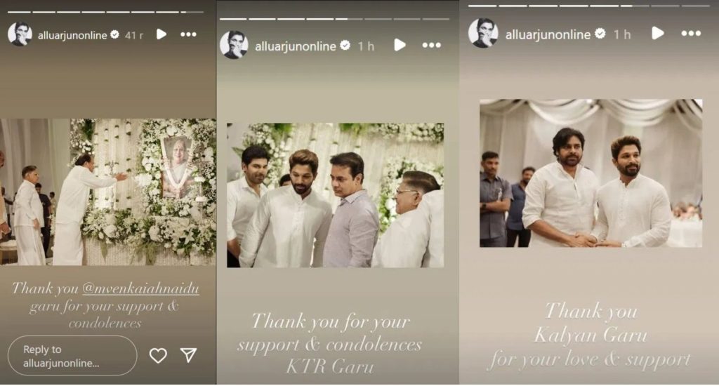इसके अलावा अल्लू अर्जुन (Allu Arjun) ने इंस्टाग्राम स्टोरी पर कुछ फोटो शेयर किया है. फोटोज में चिरंजीवी, केटीआर (केटी रामराव), पूर्व उपराष्ट्रपति वेंकैया नायडू और आंध्र प्रदेश के उपमुख्यमंत्री पवन कल्याण भी दिख रहे हैं. सभी फोटो में एक्टर ने लिखा- ‘आपके सहयोग और संवेदनाओं के लिए आभार’.