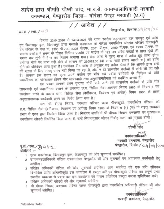 DFO ग्रीष्मी चांद ने बताया कि मामले की गंभीरता को देखते हुए गौरेला रेंजर प्रबल कुमार दुबे और डिप्टी रेंजर संत राम रजक के निलंबन का प्रस्ताव उच्च स्तर पर भेजा गया है। उन्होंने स्पष्ट किया कि इस पूरे प्रकरण में किसी भी दोषी को बख्शा नहीं जाएगा और आगे भी सख्त कार्रवाई जारी रहेगी।
