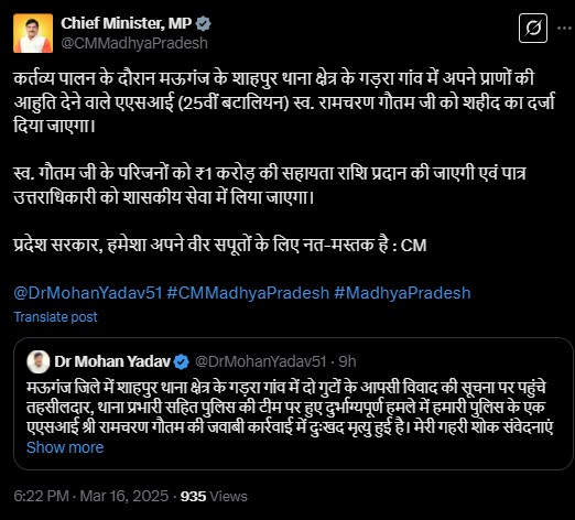मुख्यमंत्री डॉ. मोहन यादव ने सोशल मीडिया प्लेटफॉर्म एक्स पर पोस्ट कर लिखा, “कर्तव्य पालन के दौरान मऊगंज के शाहपुर थाना क्षेत्र के गड़रा गांव में अपने प्राणों की आहुति देने वाले एएसआई (25वीं बटालियन) स्व. रामचरण गौतम जी को शहीद का दर्जा दिया जाएगा। स्व. गौतम जी के परिजनों को 1 करोड़ रुपए की सहायता राशि प्रदान की जाएगी एवं पात्र उत्तराधिकारी को शासकीय सेवा में लिया जाएगा।”