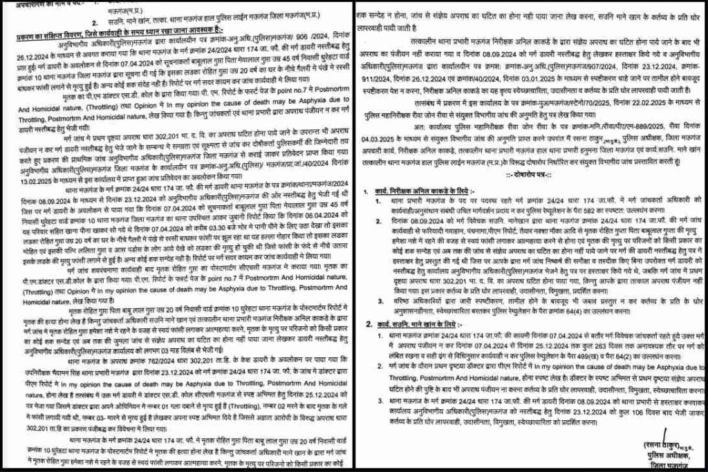खाकी के भीतर पनप रहे भ्रष्टाचार और स्वेच्छाचारिता का ये वो चेहरा है जिसे देखकर आप दंग रह जाएंगे। मऊगंज के रोहित गुप्ता हत्याकांड में जब पुलिस ने 263 दिनों तक फाइल दबाए रखी, तब तत्कालीन पुलिस अधीक्षक रसना ठाकुर ने सख्त रुख अपनाया था। उन्होंने जांच में पाया कि पीएम रिपोर्ट में ‘हत्या’ का जिक्र होने के बाद भी मामला दर्ज नहीं किया गया। तत्कालीन एसपी ने इस घोर लापरवाही पर निरीक्षक अनिल काकड़े और साउनी माने खान के खिलाफ विभागीय जांच बैठा दी थी।