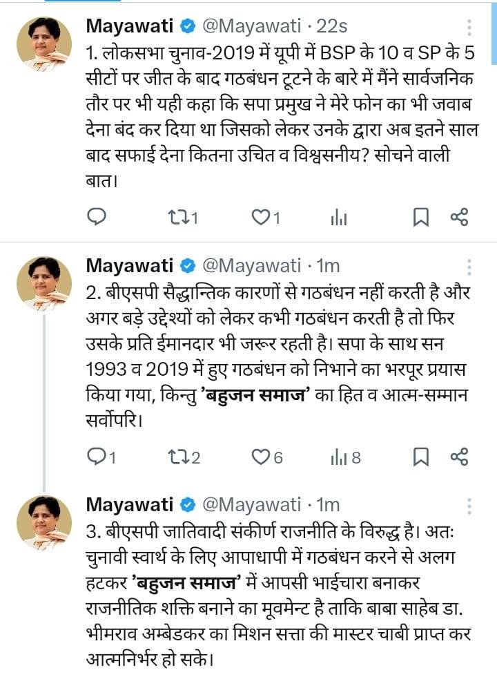 मायावती ने X पर किया पोस्ट करते हुए कहा, लोकसभा चुनाव-2019 में यूपी में BSP के 10 व SP के 5 सीटों पर जीत के बाद गठबंधन टूटने के बारे में मैंने सार्वजनिक तौर पर भी यही कहा कि सपा प्रमुख ने मेरे फोन का भी जवाब देना बंद कर दिया था, जिसको लेकर उनके द्वारा अब इतने साल बाद सफाई देना कितना उचित व विश्वसनीय? सोचने वाली बात.