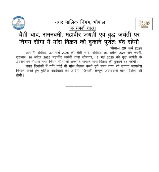 निगम द्वारा जारी आदेश के अनुसार, 30 मार्च 2025 को चैती चांद (रविवार), 06 अप्रैल 2025 को राम नवमी (गुरुवार), 10 अप्रैल 2025 को महावीर जयंती (सोमवार) और 12 मई 2025 को बुद्ध जयंती (सोमवार) के दिन भोपाल नगर निगम सीमा में सभी मांस विक्रय की दुकानें बंद रहेंगी। इसके अलावा, यदि किसी दुकान पर मांस विक्रय करते हुए पाया जाता है, तो संबंधित दुकान का लाइसेंस निरस्त कर दिया जाएगा और पुलिस कार्रवाई की जाएगी।