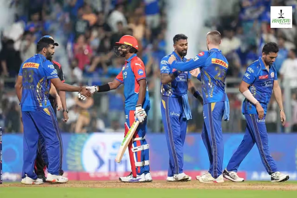 मुंबई से हार्दिक पंड्या 3, तिलक वर्मा 27, रायन रिकेलटन 25, विल जैक्स 21 और रोहित शर्मा 5 रन बनाकर आउट हुए। दिल्ली की ओर से मुकेश कुमार ने दो विकेट लिए. दुष्मंथा चमीरा, कुलदीप यादव और मुस्तफिजुर रहमान को एक-एक विकेट मिला. इस मैच में एक विकेट लेकर कुलदीप यादव ने IPL में अपना 100वां विकेट पूरा किया.