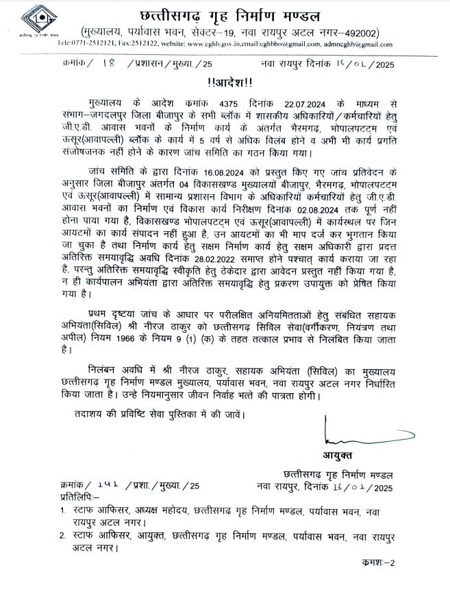 इसके बाद छत्तीसगढ़ गृह निर्माण मंडल के आयुक्त कुंदन कुमार ने पारदर्शिता और सुशासन को सुनिश्चित करने के लिए तत्काल प्रभाव से निलंबन आदेश जारी किया, ताकि राज्य के नागरिकों को गुणवत्तापूर्ण और समय पर सरकारी आवास मिल सके.