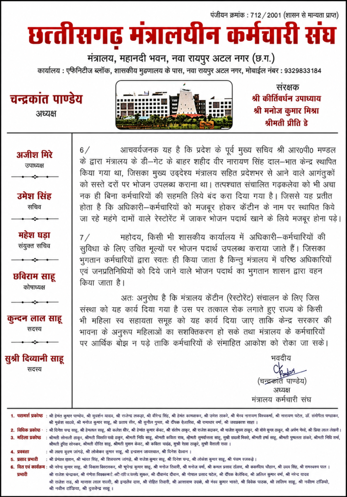 रायपुर। नवा रायपुर स्थित मंत्रालय (महानदी भवन) की कैंटीन व्यवस्था बदलने जा रही है. लंबे समय से कैंटीन संचालन इंडियन कॉफी हाउस (ICH) के माध्यम से बिना निविदा के किया जा रहा था. अब निविदा के जरिए एक एजेंसी का चयन कर कैंटीन संचालन की नई व्यवस्था लागू करने जा रही है, इस बीच मंत्रालयीन कर्मचारी संघ ने मुख्य सचिव को पत्र लिखकर महिला स्व-सहायता समूह के माध्यम से कैंटीन संचालित करने की मांग रखी है.