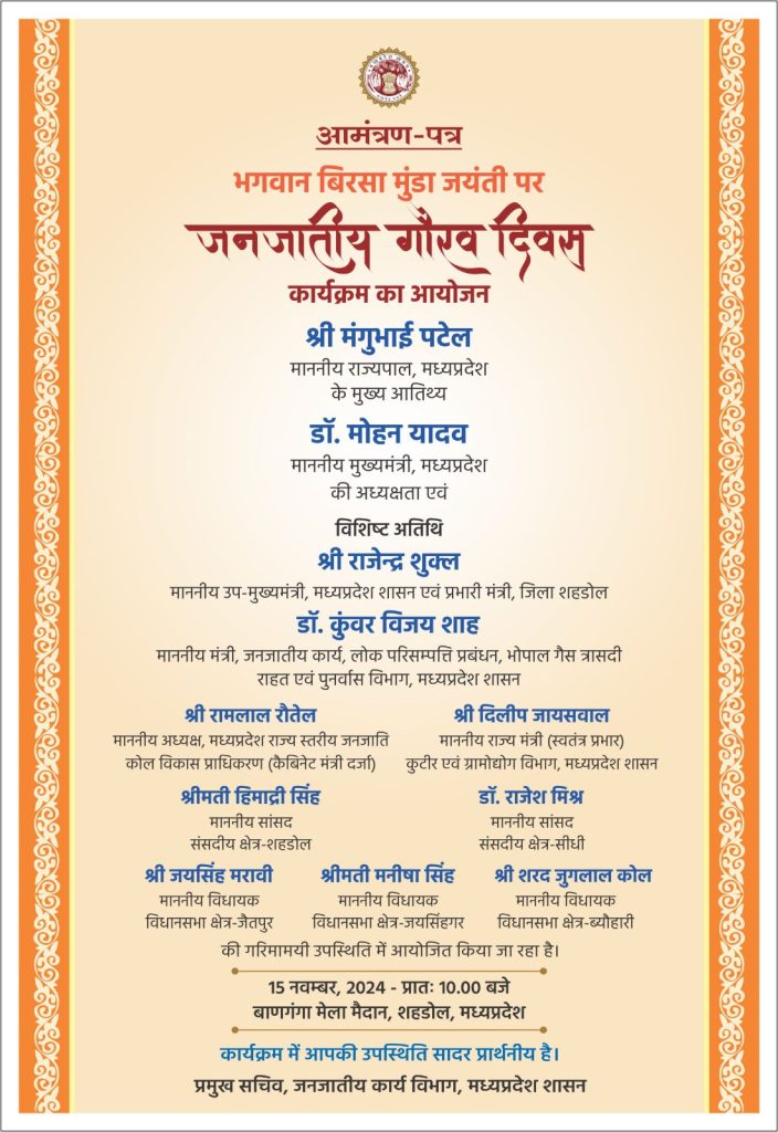 शहडोल में आज भगवान बिरसा मुंडा की जयंती पर जनजातीय गौरव दिवस कार्यक्रम आयोजित किया जाएगा। इस कार्यक्रम में राज्यपाल मंगूभाई पटेल, मुख्यमंत्री डॉ मोहन यादव समेत विभिन्न विभागों के मंत्री और संभाग के कई विधायक शामिल होंगे।