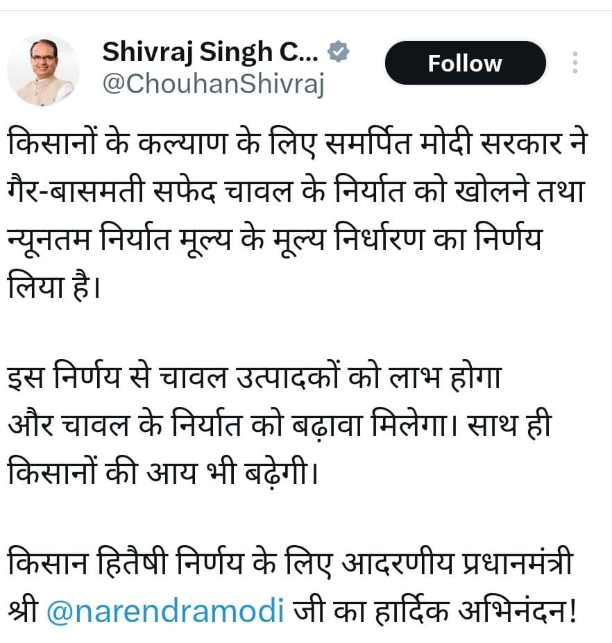 सुधीर दंडोतिया, भोपाल। केंद्र की मोदी सरकार ने किसानों के हित में एक बड़ा फैसला लिया है। गैर-बासमती चावल के निर्यात को खोलने और न्यूनतम निर्यात प्राइज के मूल्य निर्धारण को मंजूरी दी है। केंद्रीय कृषि मंत्री शिवराज सिंह चौहान ने यह जानकारी दी है।