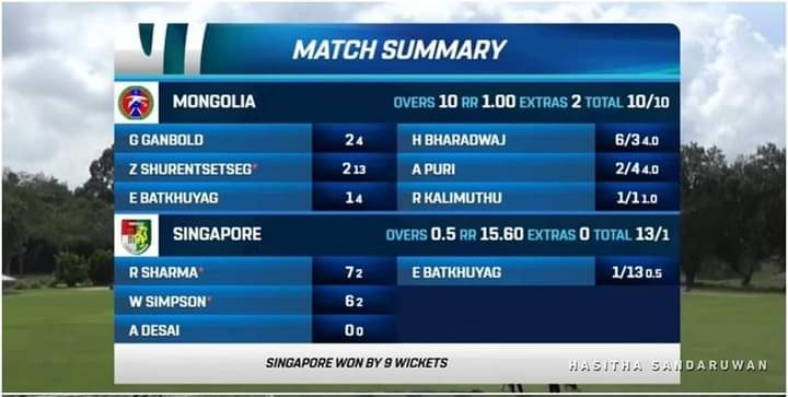 बता दें कि इस मैच में मंगोलिया के 5 बल्लेबाज अपना खाता भी नहीं खोल सके। बाकी 6 बल्लेबाजों ने कुल मिलाकर 8 रन बनाए। 2 रन सिंगापुर के गेंदबाज ने एक्स्ट्रा के रुप में मंगोलिया को तोहफे में दिए। मंगोलिया की ओर से कोई भी बल्लेबाज 2 से ज्यादा रन नहीं बना पाया। इससे पहले T20 इंटरनेशनल क्रिकेट में सबसे कम स्कोर का रिकॉर्ड 10 रन ही था। ये रिकॉर्ड पिछले साल आइल ऑफ मैन देश की टीम ने स्पेन के खिलाफ बनाया था। अब एक इस रिकॉर्ड की बराबरी हो गई है।