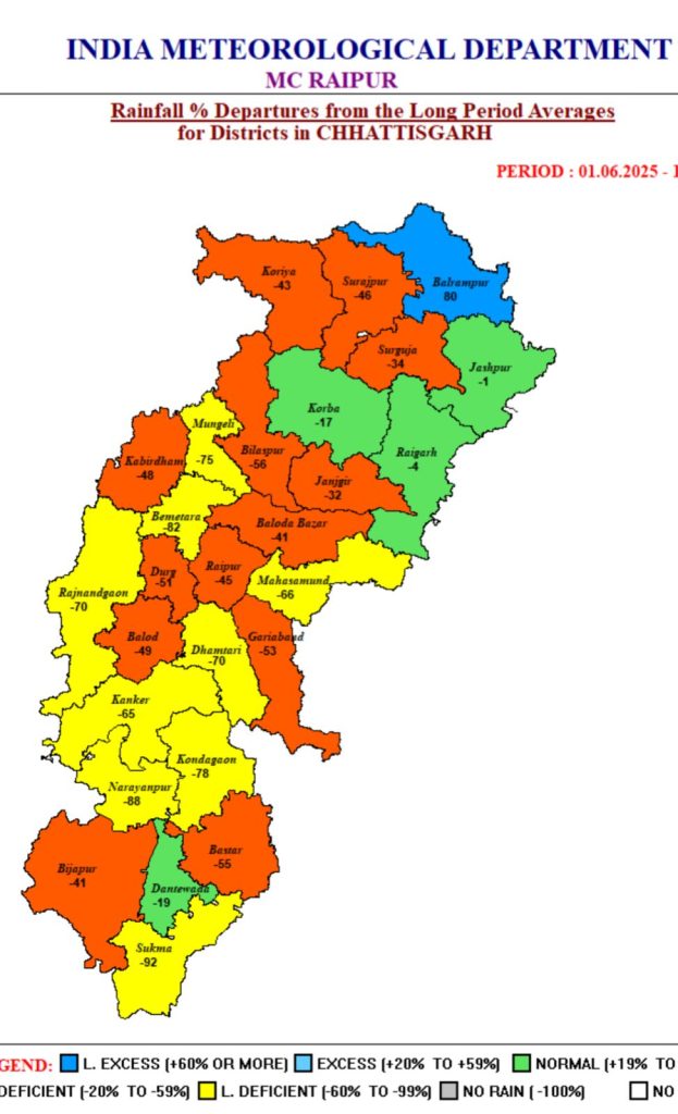 लक्षिका साहू, रायपुर। छत्तीसगढ़ में मानसून के आगमन के बाद पहले बस्तर और अब सरगुजा संभाग के जिलों में बारिश का दौर जारी है। लेकिन मानसून सीजन के पहले माह में ही पूरे प्रदेश में बारिश सामान्य से काफ़ी कम हुई है। मैदानी क्षेत्र में वर्षा सबसे कम हुई है। दशकों बाद छत्तीसगढ़ में मानसून के 15 दिनों पहले आगमन से ये अनुमान लगाए गए थे कि जून के महीने में ही तेज बारिश हो सकती है, स्थिति इसके ठीक विपरीत है। 19 जून तक प्रदेश के 22 जिलों में सामान्य से 45% कम वर्षा हुई है। इनमें 9 जिले ऐसे हैं जिनमें सामान्य से 65% कम वर्षा हुई है।