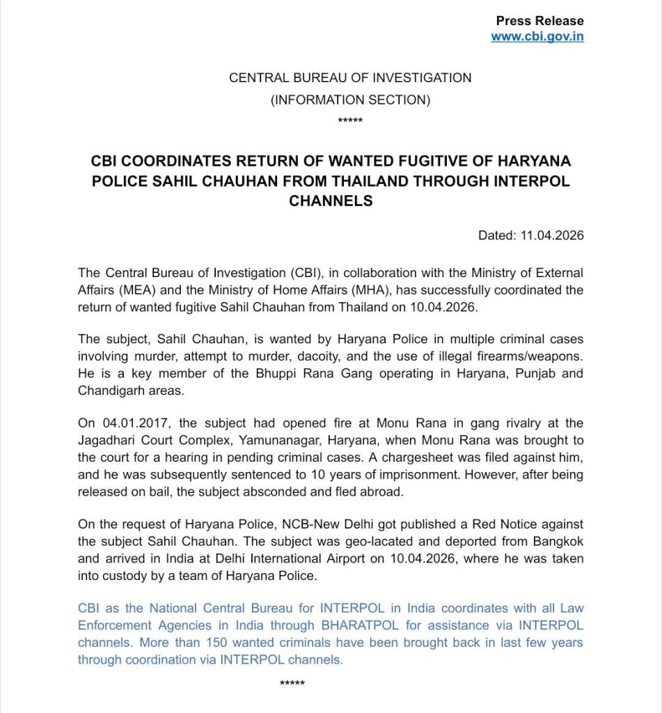 हरियाणा पुलिस का मोस्ट वांटेड और फरार अपराधी साहिल चौहान आखिरकार भारत वापस लाया गया है। उसे थाईलैंड (बैंकॉक) से इंटरपोल के रेड नोटिस के आधार पर CBI, गृह मंत्रालय (MHA) और विदेश मंत्रालय (MEA) के समन्वय से प्रत्यर्पित किया गया।