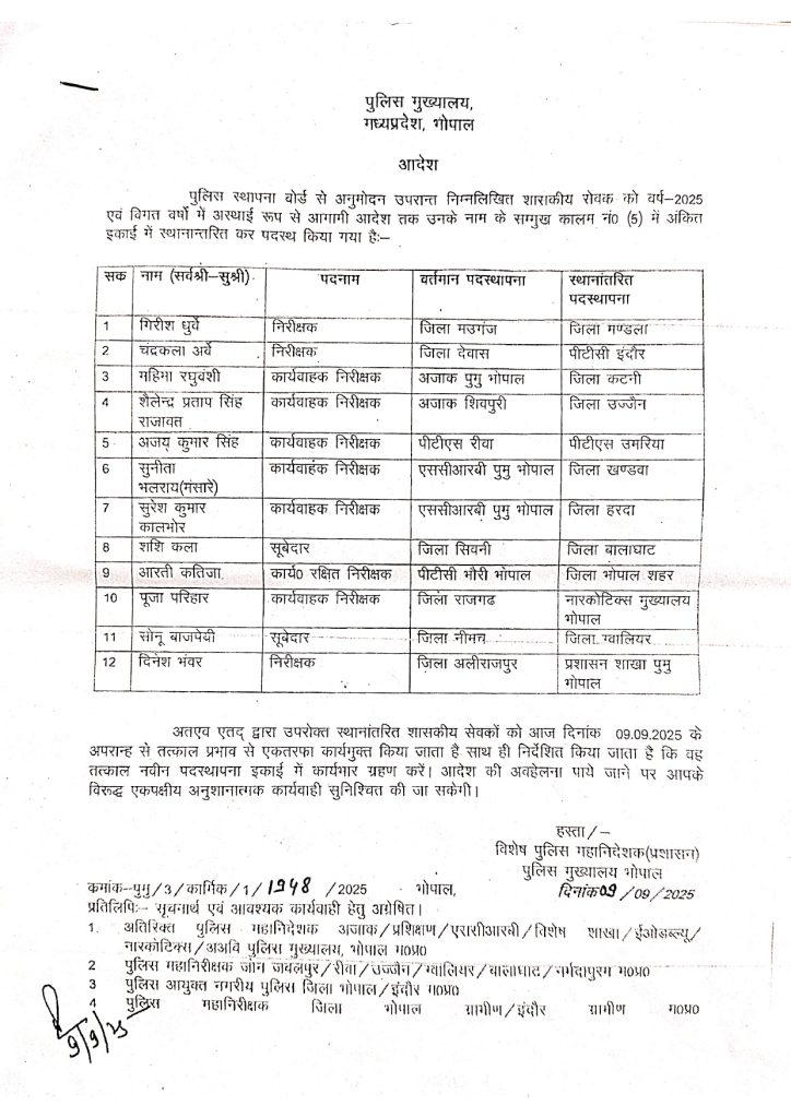 इसी तरह आरती कतिजा पीटीसी भौंरी से भोपाल शहर, पूजा परिहार राजगढ़ से नारकोटिक्स मुख्यालय भोपाल, सूबेदार सोनू वाजपेई नीमच से ग्वालियरा और दिनेश भंवर अलीराजपुर से प्रशासन शाखा PHQ,भोपाल स्थानांतरित किए गए हैं।