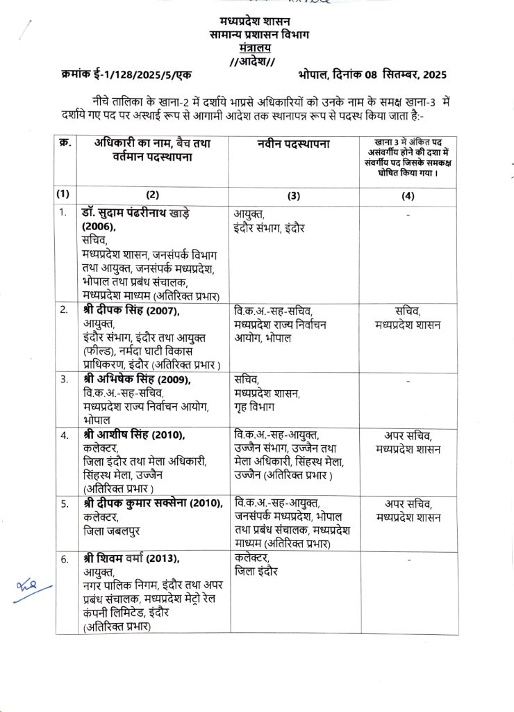 इंदौर कमिश्नर दीपक सिंह राज्य निर्वाचन आयोग में सचिव बनाए गए हैं। अभिषेक सिंह गृह विभाग के सचिव बनाए गए। इससे पहले वह राज्य निर्वाचन आयोग में सचिव थे।