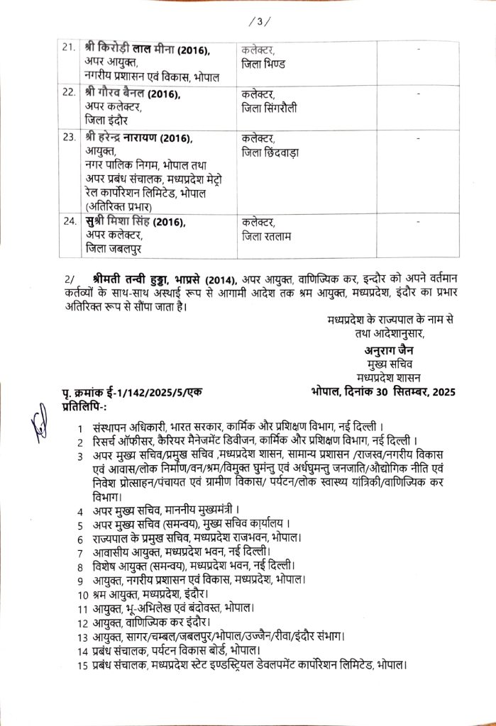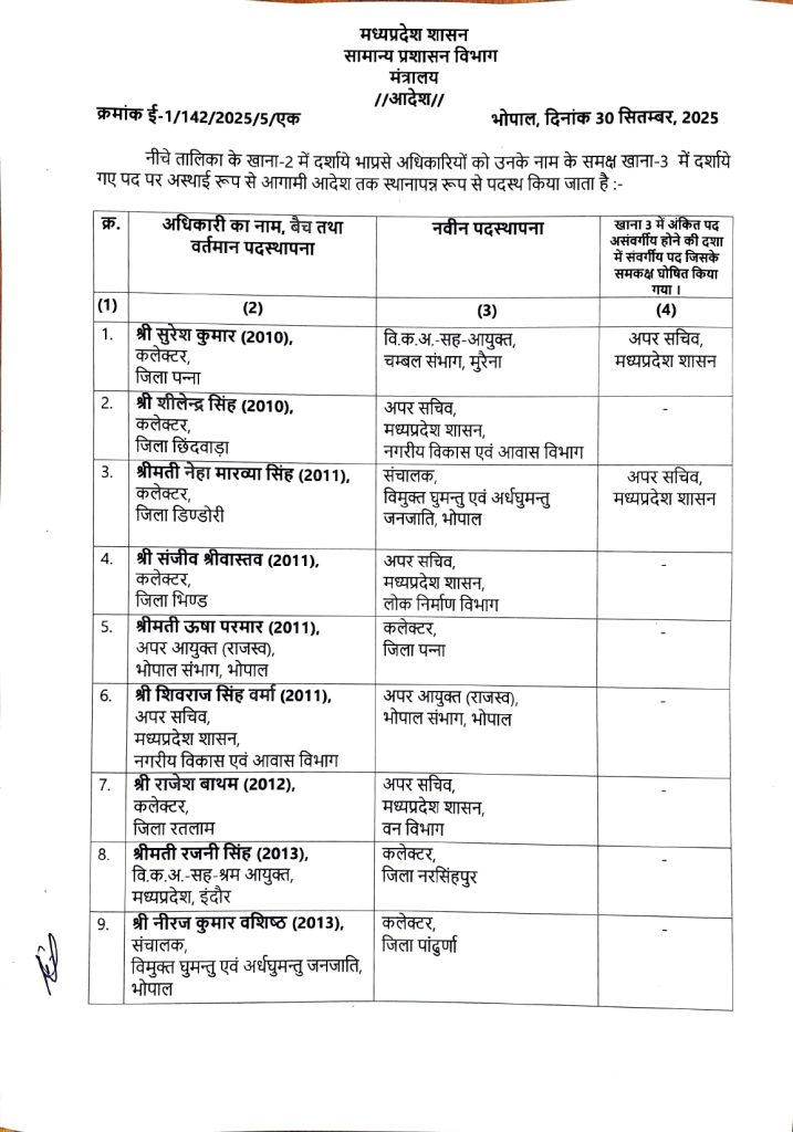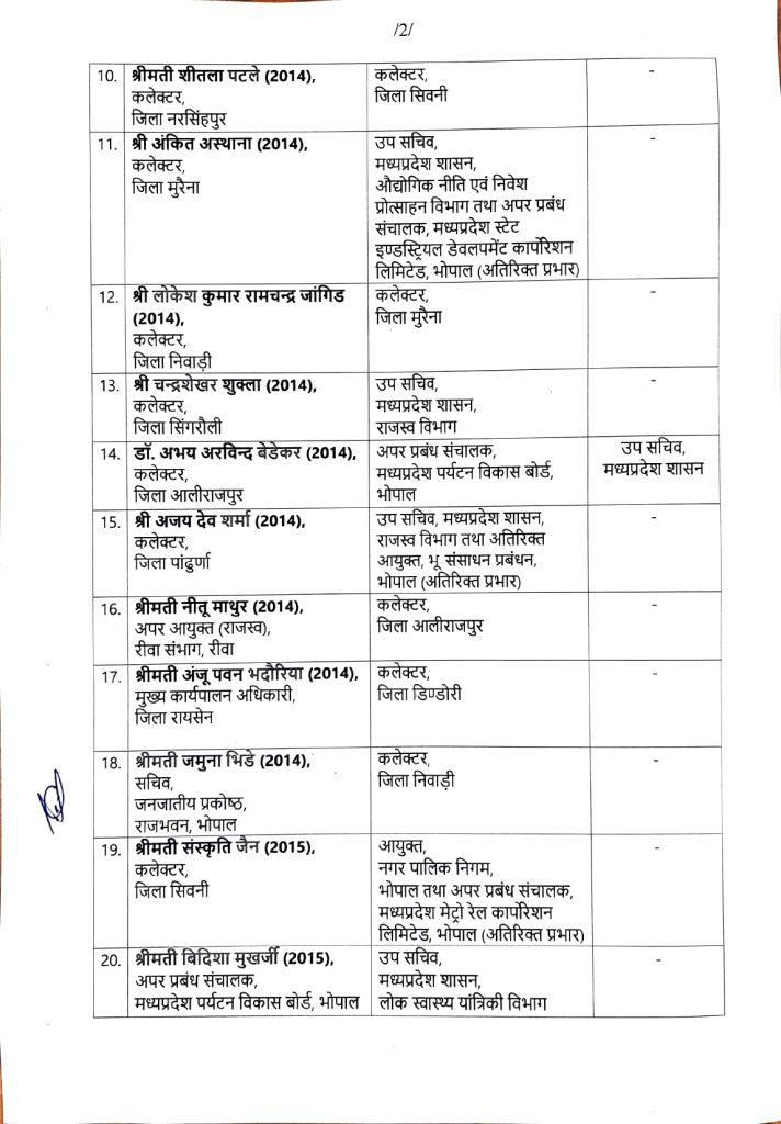 करोड़ी लाल मीणा को बनाया भिंड कलेक्टर, गौरव बैनल सिंगरौली कलेक्टर, हरेंद्र नारायण छिंदवाड़ा कलेक्टर बनाए गए हैं। वहीं निशा सिंह को रतलाम, जमुना भिड़े को निवाड़ी, अंजू पवन भदोरिया को डिंडोरी, नीतू माथुर को अलीराजपुर और लोकेंद्र कुमार को मुरैना कलेक्टर का दायित्व मिला है। वहीं उषा परमार को पन्ना कलेक्टर बनाया गया है।