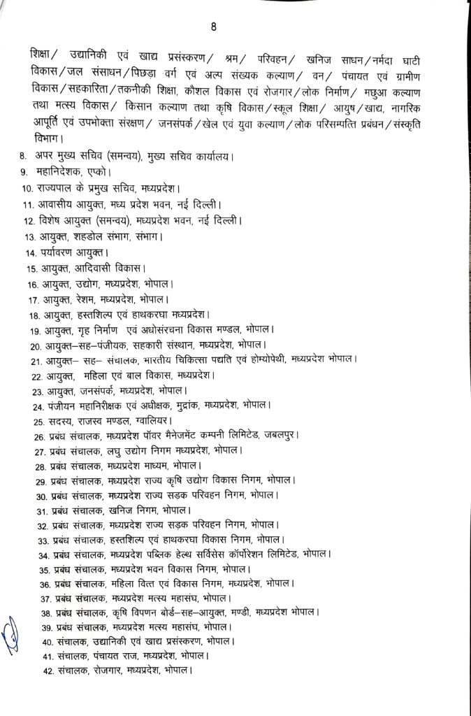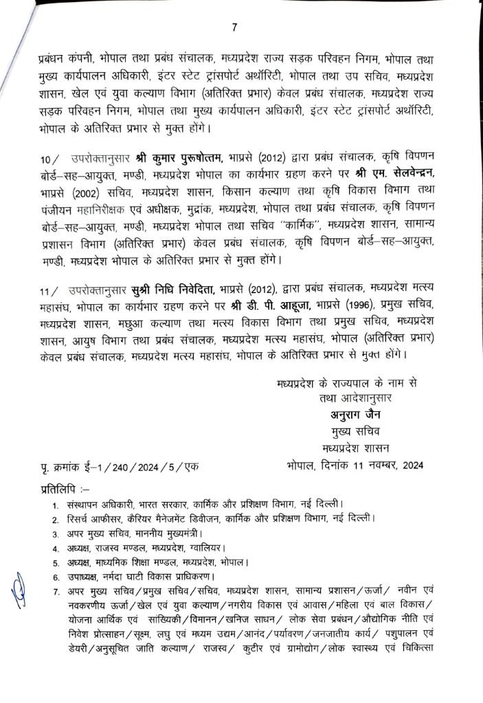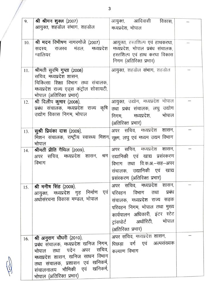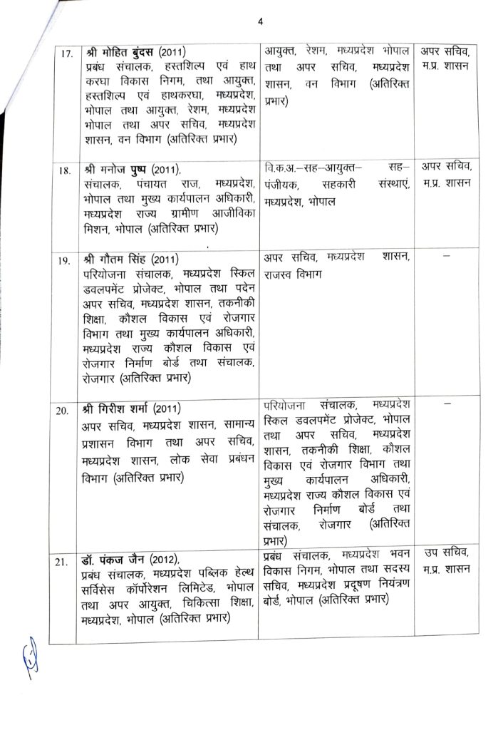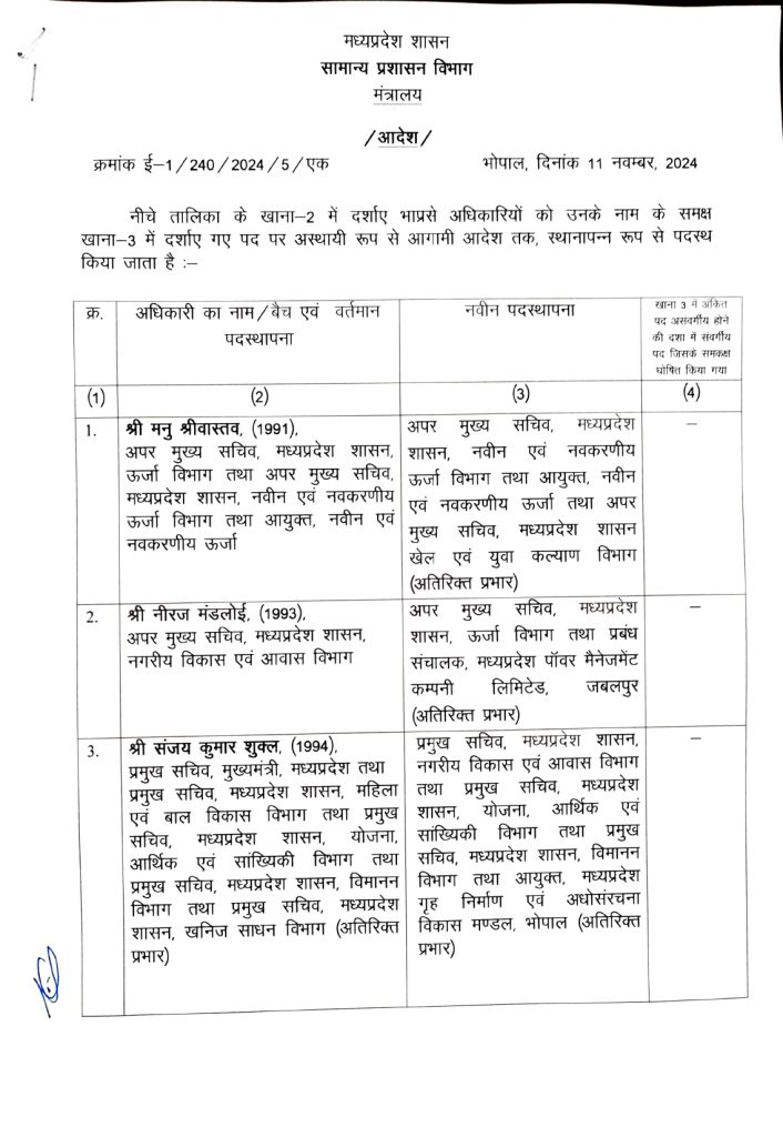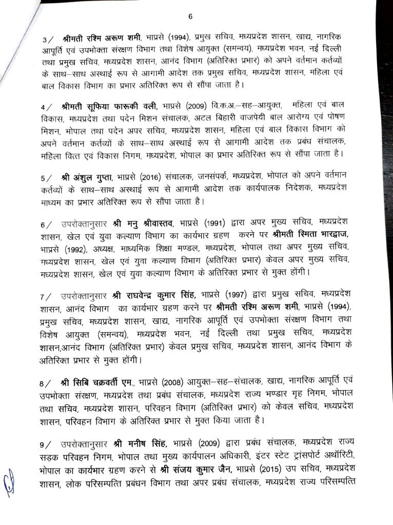 मनु श्रीवास्तव को नवीन एवं नवकरणीय ऊर्जा विभाग के अपर मुख्य सचिव की जिम्मेदारी दी गई है। संजय कुमार शुक्ला नगरीय विकास एवं आवास विभाग के प्रमुख सचिव बनाए गए हैं। राघवेंद्र सिंह को उद्योग विभाग का जिम्मा सौंपा गया है।