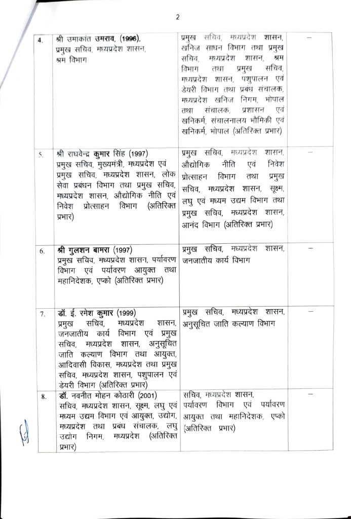उमाकांत उमराव खनिज साधन विभाग के प्रमुख सचिव बनाए गए हैं। गुलशन बामोरा को जनजातीय कार्य विभाग के प्रमुख सचिव की जिम्मेदारी दी गई है। नवनीत मोहन कोठारी पर्यावरण विभाग के सचिव बनाए गए हैं। श्रीमन शुक्ल को आदिवासी विकास विभाग आयुक्त का प्रभार सौंपा गया है।