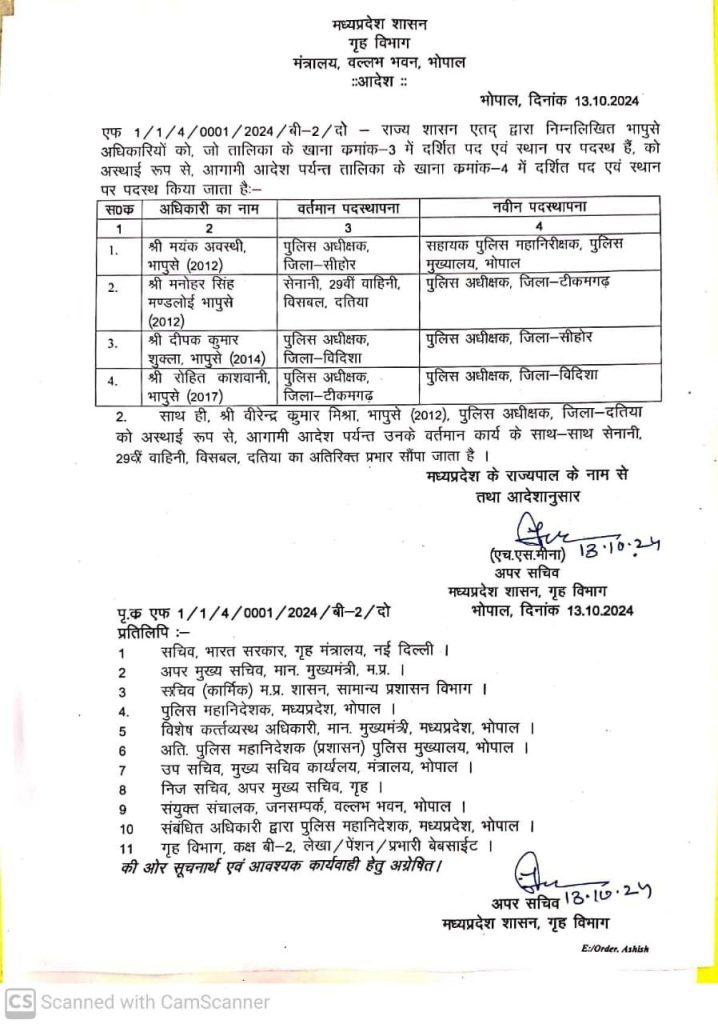 आदेश के अनुसार, टीकमगढ़, सीहोर और विदिशा के एसपी बदले गए हैं। मनोहर सिंह टीकमगढ़ जिले के नए पुलिस अधीक्षक होंगे। विदिशा के एसपी दीपक कुमार अब सीहोर जिले की जिम्मेदारी संभालेंगे। टीकमगढ़ के एसपी रोहित काशवानी अब विदिशा के एसपी होंगे।