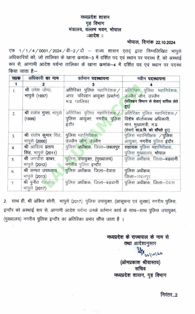 शब्बीर अहमद, भोपाल। IPS TRANSFER BREAKING: मध्य प्रदेश में देर रात तबादला एक्सप्रेस चली है, जहां 7 आईपीएस अफसरों को इधर से उधर कर दिया गया है। पुलिस विभाग में फेरबदल होने की वजह से कई जिलों के एसपी बदल गए। सोकर उठते ही कई अफसरों के हाथ में ट्रांसफर का लेटर दिखेगा। इन अफसरों में एक नाम इंदौर कमिश्नर राकेश गुप्ता का भी है, जो अब मुख्यमंत्री डॉ. मोहन यादव के OSD पद की जिम्मेदारी संभालेंगे। गृह विभाग ने इसका आदेश जारी कर दिया है।