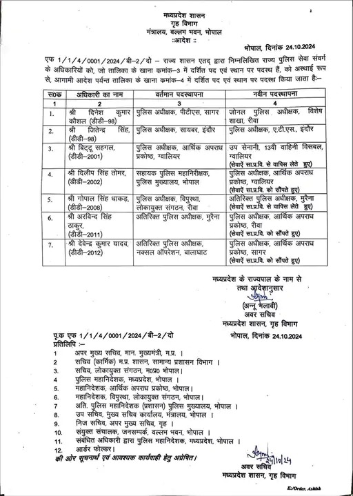 एसपी पीटीएस (सागर) दिनेश कुमार कौशल को जोनल पुलिस अधीक्षक, विशेष शाखा रीवा भेजा गया है। जबकि इंदौर के साइबर एसपी जितेंद्र सिंह को एटीएस एसपी (ATS SP) इंदौर बनाया गया है। एसपी विपुस्था लोकायुक्त संगठन रीवा, गोपाल सिंह धाकड़ को अतिरिक्त पुलिस अधीक्षक मुरैना बनाया गया है।