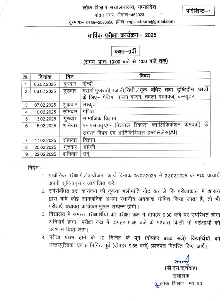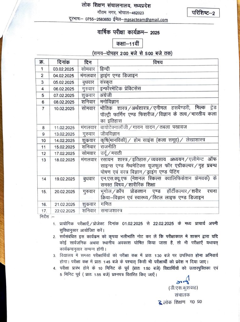 दोनों परीक्षाओं का अंतिम इम्तिहान 22 फरवरी को होगा। दो पारी में परीक्षा होगी। 9वीं की वार्षिक परीक्षा सुबह 10 से दोपहर 1 बजे के बीच होगी। 11वीं की वार्षिक परीक्षा दोपहर 2 से 5 शाम के बीच होगी।