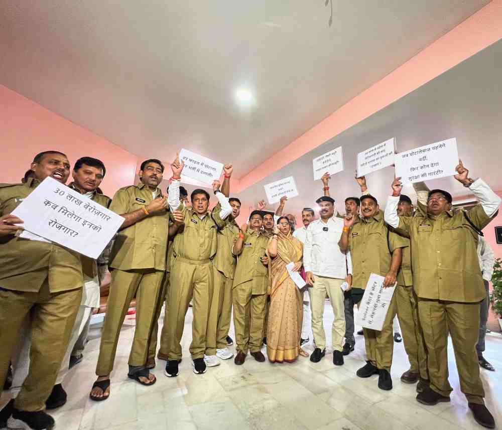 भोपाल। MP Assembly Monsoon Session: मध्य प्रदेश विधानसभा मानसून सत्र का आज आठवां दिन है। कांग्रेस ने आरक्षक भर्ती गड़बड़ी मामले को लेकर विधानसभा में अनोखा प्रदर्शन किया। विधायक पुलिस की ड्रेस पहनकर विधायक पहुंचे। आरक्षण भर्ती मामले की जांच की मांग करते हुए गांधी प्रतिमा के पास बैठकर विरोध प्रदर्शन किया।