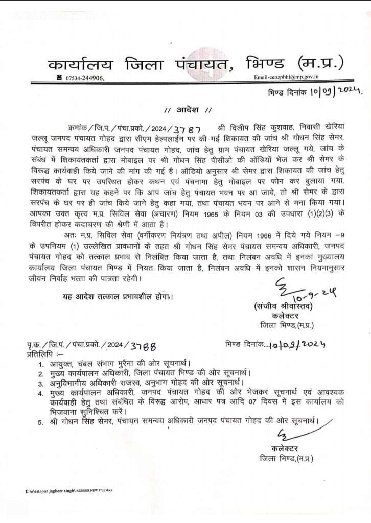 धर्मेंद्र ओझा, भिंड। मध्य प्रदेश के भिंड के गोहद जनपद पंचायत के समन्वय अधिकारी (PCO) को तत्काल प्रभाव से निलंबित (Suspend) कर दिया गया है। जांच फर्जी तरीके से करने पर यह कार्रवाई की गई है। लल्लूराम डॉट कॉम ने इस खबर को प्रमुखता से प्रकाशित किया था। जिसके बाद कलेक्टर ने तत्काल पीसीओ को सस्पेंड कर दिया।