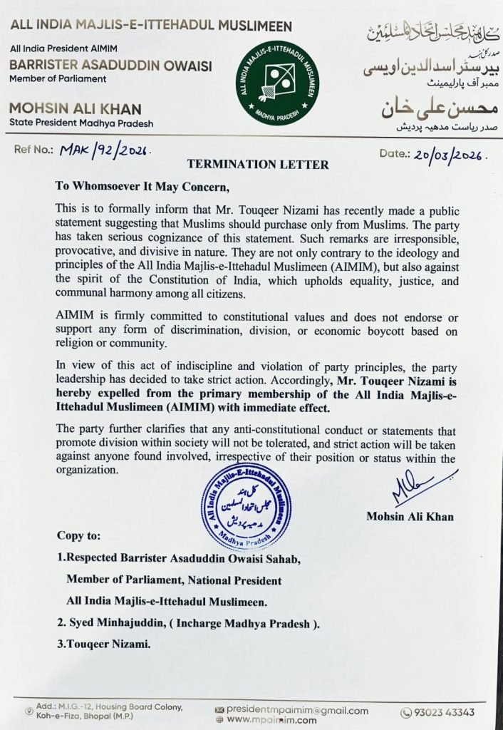 हालांकि तौक़ीर निजामी के बयान पर विवाद बढ़ने के बाद मुस्लिम समाज ने एक अपील की। जिसमें कहा गया कि ‘मुस्लिम सबसे खरीदी करें और नफरती लोगों को जवाब दें।’ वहीं तौक़ीर निजामी के इस बयान को AIMIM पार्टी ने गंभीरता से लिया और इसे आइडियोलॉजी के खिलाफ बताया है। AIMIM एमपी के अध्यक्ष मोहसिन अली खान ने तौक़ीर को पार्टी से टर्मिनेट कर दिया है।
