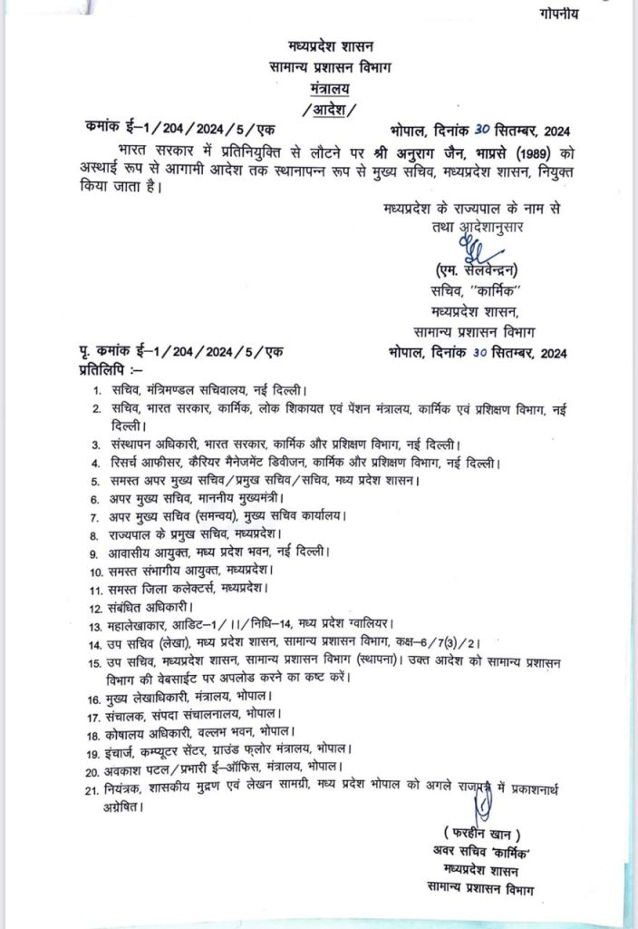 भोपाल। 1989 बैच के आईएएस अधिकारी अनुराग जैन मध्य प्रदेश के नए मुख्य सचिव होंगे। इस संबंध में सामान्य प्रशासन विभाग ने आदेश जारी कर दिया है। अनुराग जैन की सेंट्रल डेपुटेशन से वापसी होगी। प्रदेश सरकार की रिक्वेस्ट पर केंद्र ने उन्हें वापस भेज दिया है। वे कल मंगलवार को भोपाल पहुंच सकते हैं।