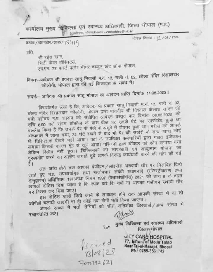 दरअसल, 8 अगस्त 2025 को भोपाल के सिटी केयर हॉस्पिटल में राहुल साहू की संदिग्ध परिस्थितियों में मौत हो गई थी। परिजनों ने अस्पताल और डॉक्टरों पर गलत इंजेक्शन देने का गंभीर आरोप लगाया था। इसे लेकर मुख्य चिकित्सा एवं स्वास्थ्य अधिकारी ने एक आदेश जारी किया है। जिसमें कहा गया कि विषयांतर्गत लेख है कि आवेदक प्रकाश साहू निवासी म.नं. 12, गली नं. 02, छोला मंदिर रिसालदार कॉलोनी, भोपाल द्वारा मंत्री विश्वास कैलाश सारंग को संबोधित आवेदन प्रस्तुत कर दिनांक 8 अगस्त को रात 8 बजे संगम टॉकीज के पास ब्रीज पर उनके बेटे का एक्सीडेंट हुआ था।