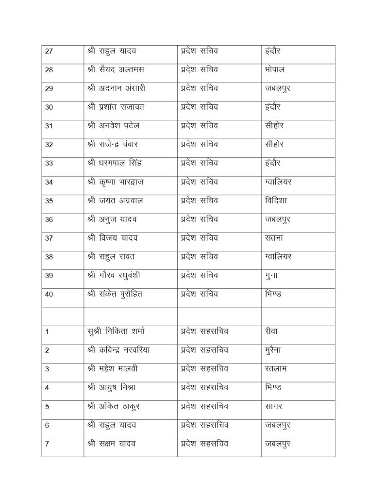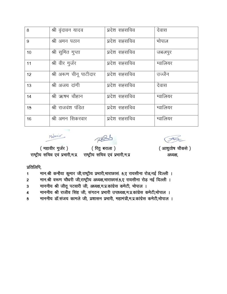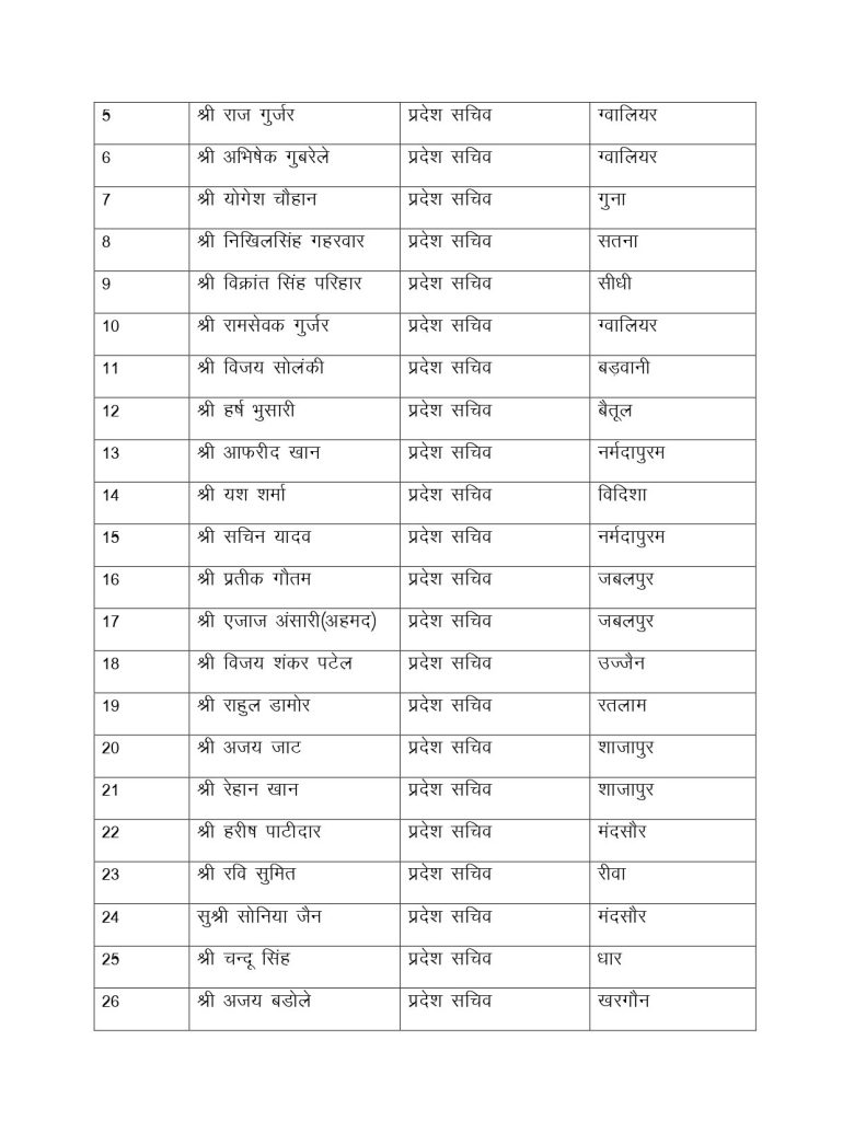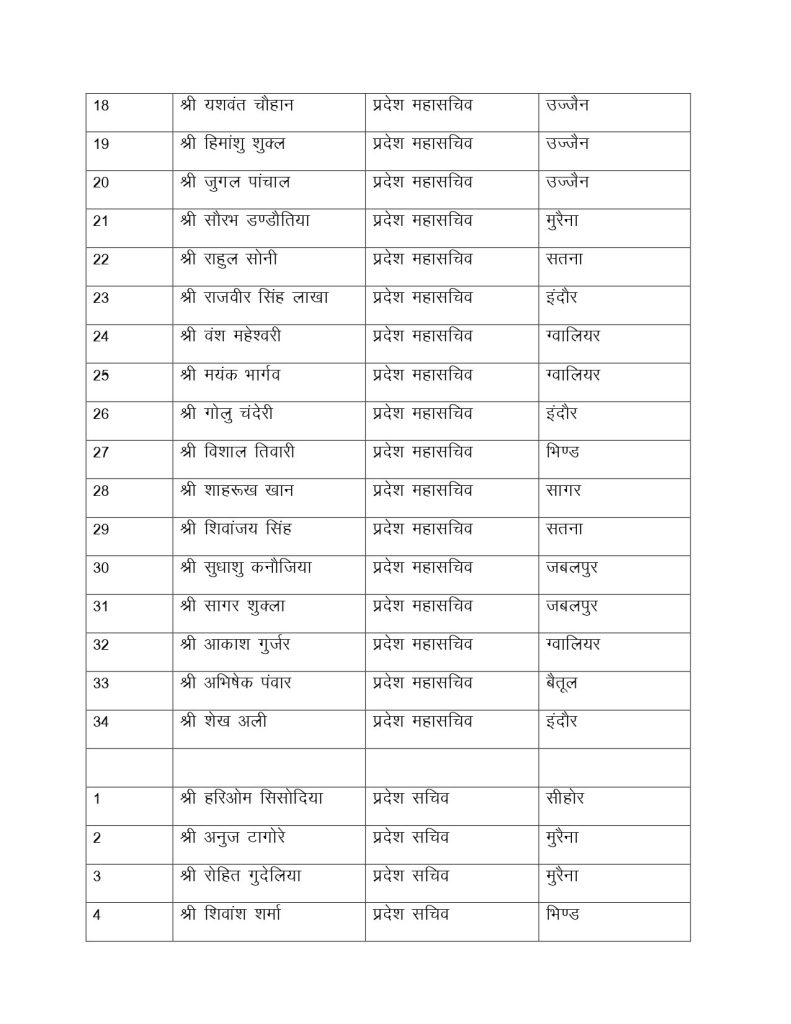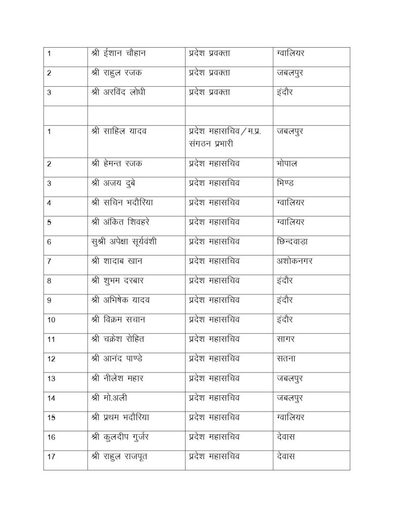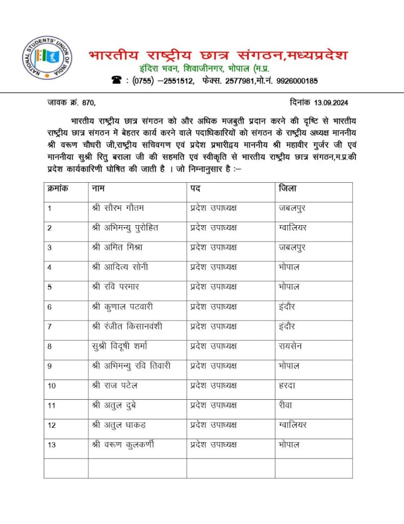 सूची के मुताबिक, 13 प्रदेश उपाध्यक्ष बनाए गए है। रवि तिवारी, रवि परमार, कुणाल पटवारी समेत 13 उपाध्यक्ष बनाए गए है। प्रदेश कार्यकारिणी में 34 महासचिव, 40 प्रदेश सचिव और 16 प्रदेश महासचिव बनाए गए है। आपको बता दें कि लंबे समय से NSUI की प्रदेश कार्यकारिणी अटकी हुई थी। प्रदेश अध्यक्ष बने हुए आशुतोष चौकसे को 2 साल से ज्यादा हो गए थे, लेकिन कार्यकारिणी घोषित नहीं कर पा रहे थे।