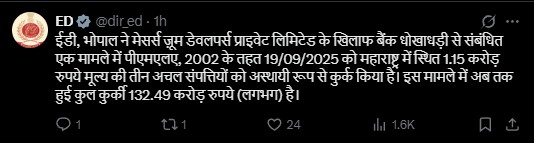 ED ने इसकी जानकारी देते हुए कहा सोशल मीडिया प्लेटफॉर्म एक्स पर लिखा, ‘ईडी भोपाल ने मेसर्स जूम डेवलपर्स प्राइवेट लिमिटेड के खिलाफ बैंक धोखाधड़ी से संबंधित एक मामले में पीएमएलए, 2002 के तहत 19/09/2025 को महाराष्ट्र में स्थित 1.15 करोड़ रुपये मूल्य की तीन अचल संपत्तियों को अस्थायी रूप से कुर्क किया है। इस मामले में अब तक हुई कुल कुर्की 132.49 करोड़ रुपये (लगभग) है।’