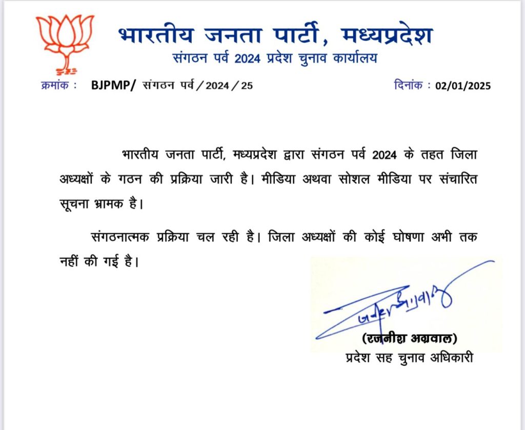 प्रदेश सह चुनाव अधिकारी रजनीश अग्रवाल ने एक पत्र जारी किया है। जिसमें उन्होंने कहा कि भारतीय जनता पार्टी, मध्यप्रदेश द्वारा संगठन पर्व 2024 के तहत जिला अध्यक्षों के गठन की प्रक्रिया जारी है। मीडिया अथवा सोशल मीडिया पर इस संबंध में संचारित सूचना भ्रामक है। संगठनात्मक प्रक्रिया चल रही है। जिला अध्यक्षों की कोई घोषणा अभी तक नहीं की गई है।