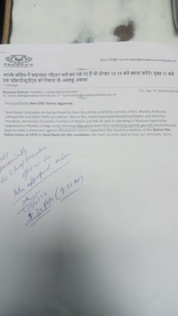 मिली जानकारी के मुताबिक, भोपाल के पीपल्स यूनिवर्सिटी को बम से उड़ाने की धमकी मिली है। यह धमकी मेल के के जरिए दी गई है। जिसमें धमकी देने वाले शख्स ने कॉलेज की बिल्डिंग में बम रखने की बात कही है। उनसे लिखा- आपके कॉलेज में सायनाइड पॉइजन वाले बम रखे हैं। जो दोपहर 12:15 बजे ब्लास्ट करेंगे। सुबह 11:00 बजे तक डॉक्टर, स्टूडेंट को निकाल ले…अल्लाह हू अकबर।