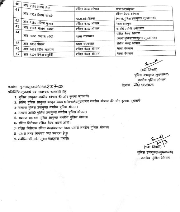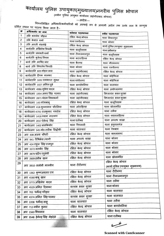 शब्बीर अहमद, भोपाल। मध्य प्रदेश में तबादले का दौर जारी है। सीनियर आईपीएस अधिकारियों के बाद अब पुलिस विभाग में थोक में तबादला किया गया है। कई पुलिस अधिकारी-कर्मचारी इधर से उधर किए गए है। यह ट्रांसफर केवल भोपाल जिले में हुआ है। इस संबंध में भोपाल नगरीय पुलिस उपायुक्त श्रद्धा तिवारी ने आदेश जारी किया है।