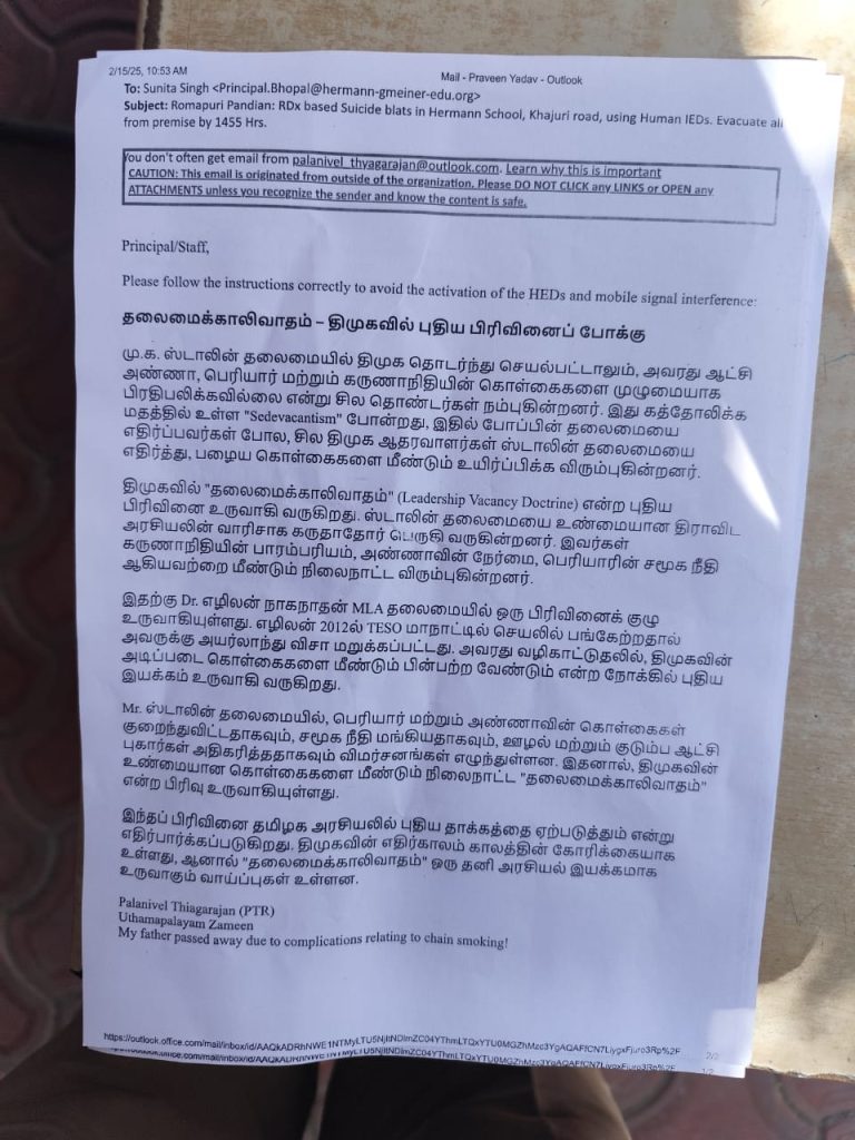 दरअसल, पिपलानी इलाके के हरमन माइनर स्कूल को यह धमकी मिली है। आज स्कूल की छुट्टी थी, लेकिन स्टाफ के कुछ सदस्य और कुछ छात्रों के परिजन मीटिंग के लिए मौजूद थे। इस दौरान सुबह 10.30 बजे ऑफिशियल मेल आईडी पर किसी ने तेलगु भाषा में धमकी भरा लेटर भेजा।