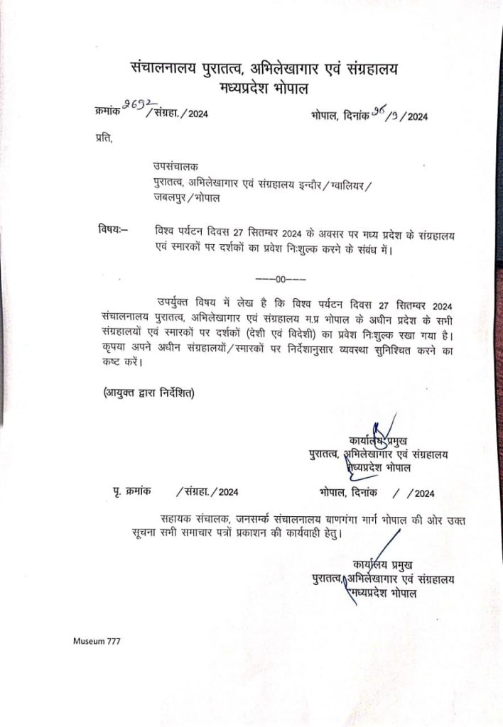 भोपाल के अधीन प्रदेश के सभी संग्रहालयों एवं स्मारकों में आज फ्री में एंट्री मिलेगी। देशी और विदेशी दर्शकों को आज कोई शुल्क नहीं देना पड़ेगा। पुरातत्व, अभिलेखागार एवं संग्रहालय ने अधीन संग्रहालयों, स्मारकों पर निर्देशानुसार व्यवस्था सुनिश्चित करने के निर्देश दिए हैं।
