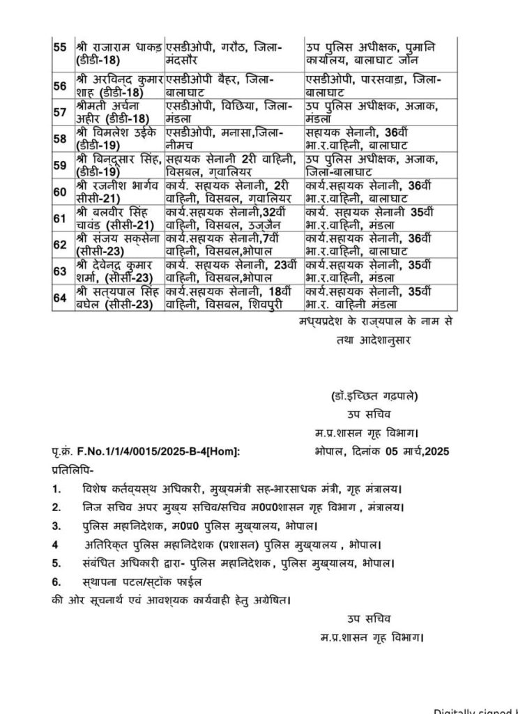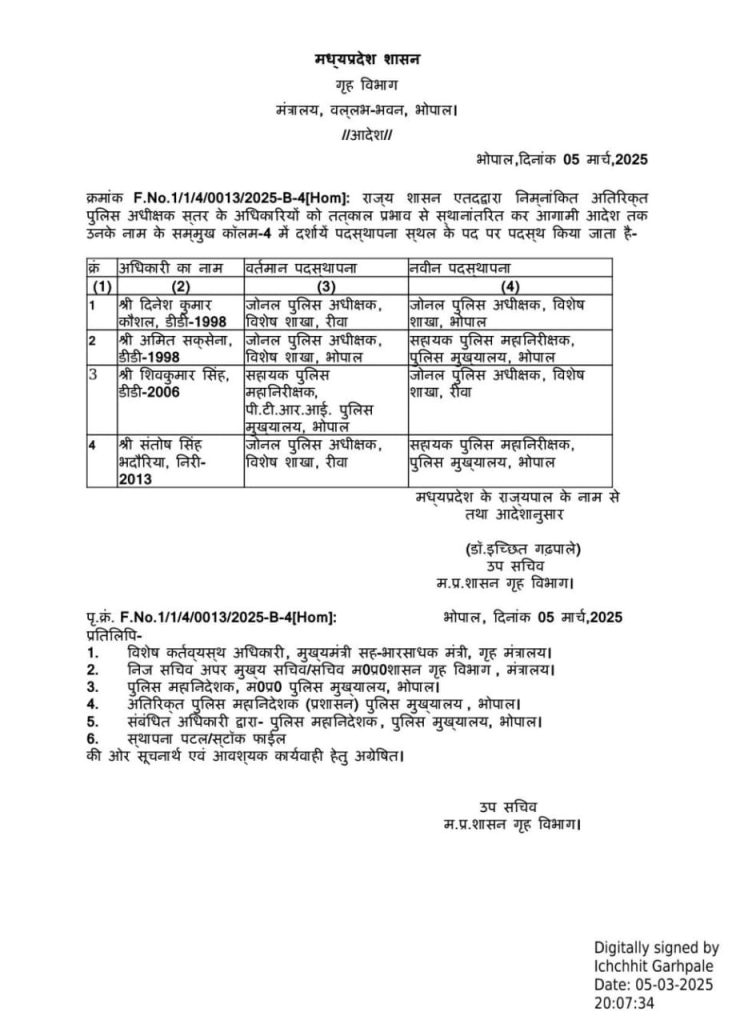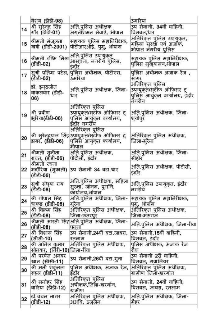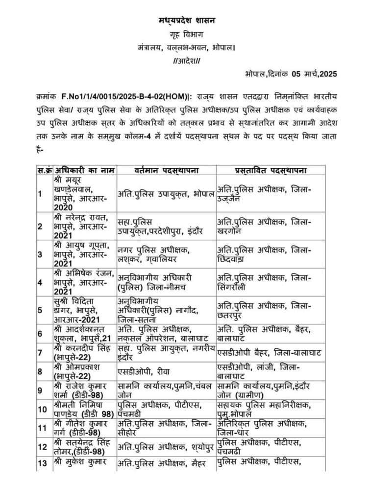 भोपाल पुलिस मुख्यालय के सहायक पुलिस महानिरीक्षक के पद पर संतोष सिंह भदोरिया को नियुक्त किया गया। है। लश्कर नगर पुलिस अधीक्षक ग्वालियर आईपीएस आयुष गुप्ता को स्थानांतरित करके अतिरिक्त पुलिस अधीक्षक जिला छिंदवाड़ा के पद पर नियुक्त किया गया है।