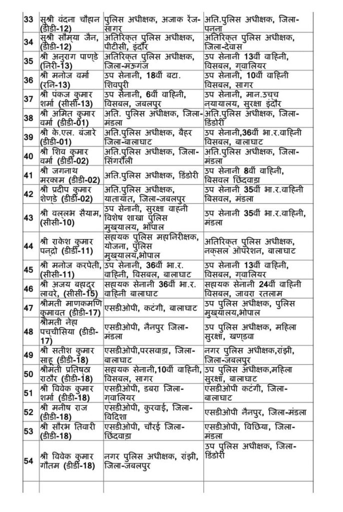 इसके अलावा सिंगरौली, छतरपुर, बालाघाट के अतिरिक्त पुलिस अधीक्षक भी बदले गए हैं। बालाघाट जिले में एसडीओपी बैहर के पद पर आईपीएस करणदीप सिंह को नियुक्त किया गया है। एसडीओपी रीवा पद पर कार्यरत आईपीएस ओम प्रकाश को एसडीओपी लांजी जिला बालाघाट के पद पर नियुक्त किया गया है।